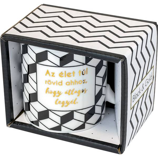 Szemet gyönyörködtető ajándék bögre, barátoknak, rokonoknak. A bögre fehér és fekete színekben pompázik. Külsejét négyzet alakú téglalapok díszítik, amelyek igazán letisztult stílust kölcsönöznek neki. A bögre elején fekete keretben arany betűkkel ez a felirat olvasható: „Az élet túl rövid ahhoz, hogy átlagos legyél”.
