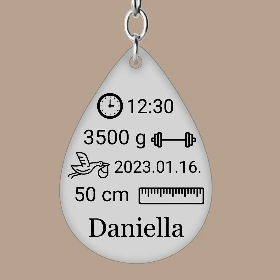 A baba emlékőrző a babád születésének pillanatait idézi, ezért úgy alkottuk meg, hogy minden fontos információt tartalmazzon, többek között a gyermek születésének dátumát, azt, hogy milyen súllyal és hosszal született, a születés pontos idejét órára, percre bontva és természetesen a gyerkőc keresztnevét. Az egyes adatokhoz különböző szimbólumokat is társítunk,mint például gólyát, órát, súlyzót és vonalzót. Ezekkel a grafikákkal még kedvesebb és babásabb kinézetet varázsolunk a kulcstartónak.