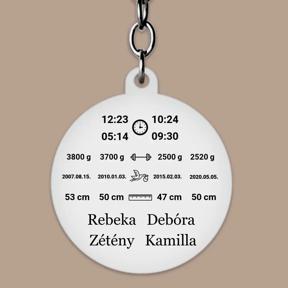 Meseszép négy gyermekes baba emlékőrző kulcstartó, a gyermekeid nevével, születésük dátumával és a születési adataikkal. Szemet gyönyörködtető baba emlékőrző medál, amely csodás ajándék babavárás, vagy babaköszöntés alkalmából. A gravírozott kulcstartóra különböző cuki, babás charmokat is választhatsz.