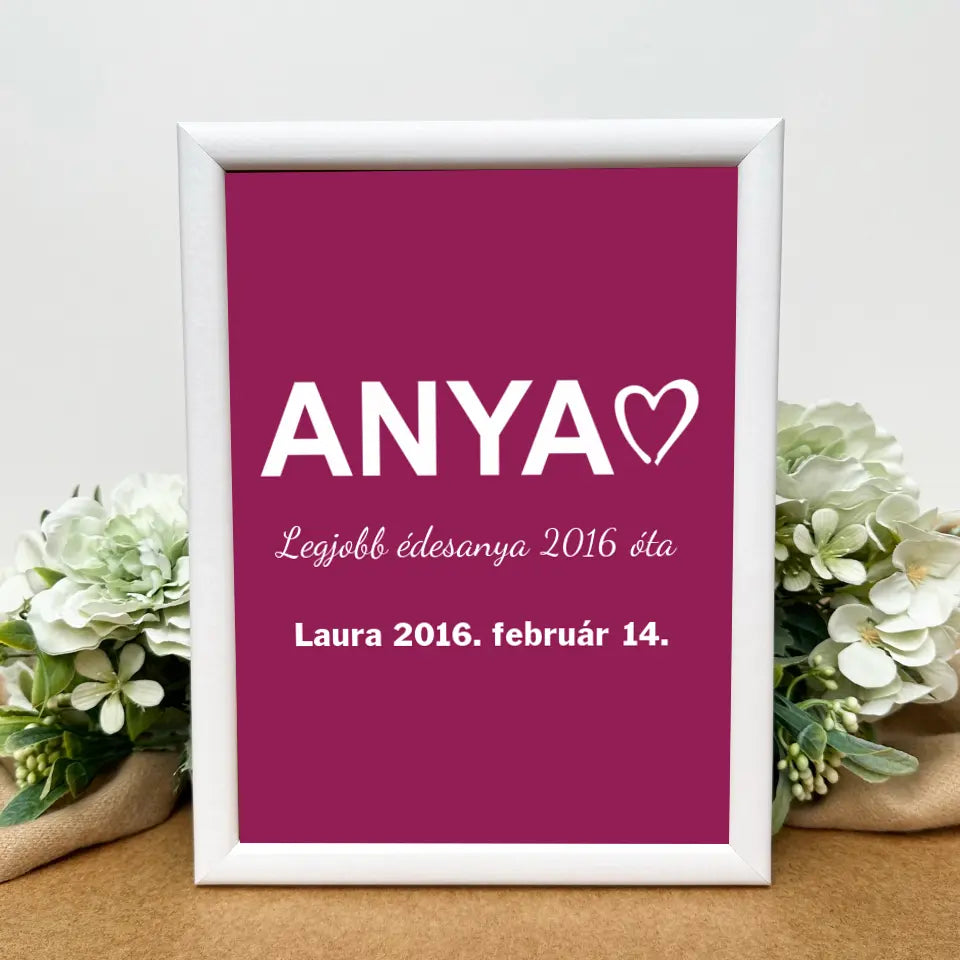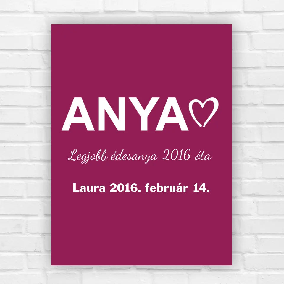 Közeledik az édesanyád szülinapja? Jól jönne valami klassz ajándék ötlet? Jó helyen jársz! A "Szülinapi ajándék anyának" nevű egyedi képünk tökéletes meglepetés minden édesanya számára. A képen szerepel, hogy az anyuka mikor vált édesanyává, a kép alsó részébe, pedig a gyermekeinek a keresztneve, illetve a születésük dátuma kerülhet. Egy édesanyának nincs ennél szebb ajándék, hiszen a legdrágább kincseiről mesél neki. A gyermekekről, akiket a világon mindennél jobban szeret.