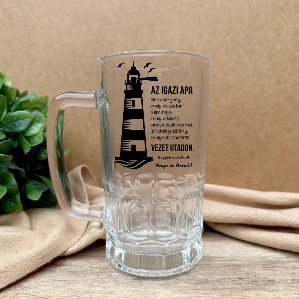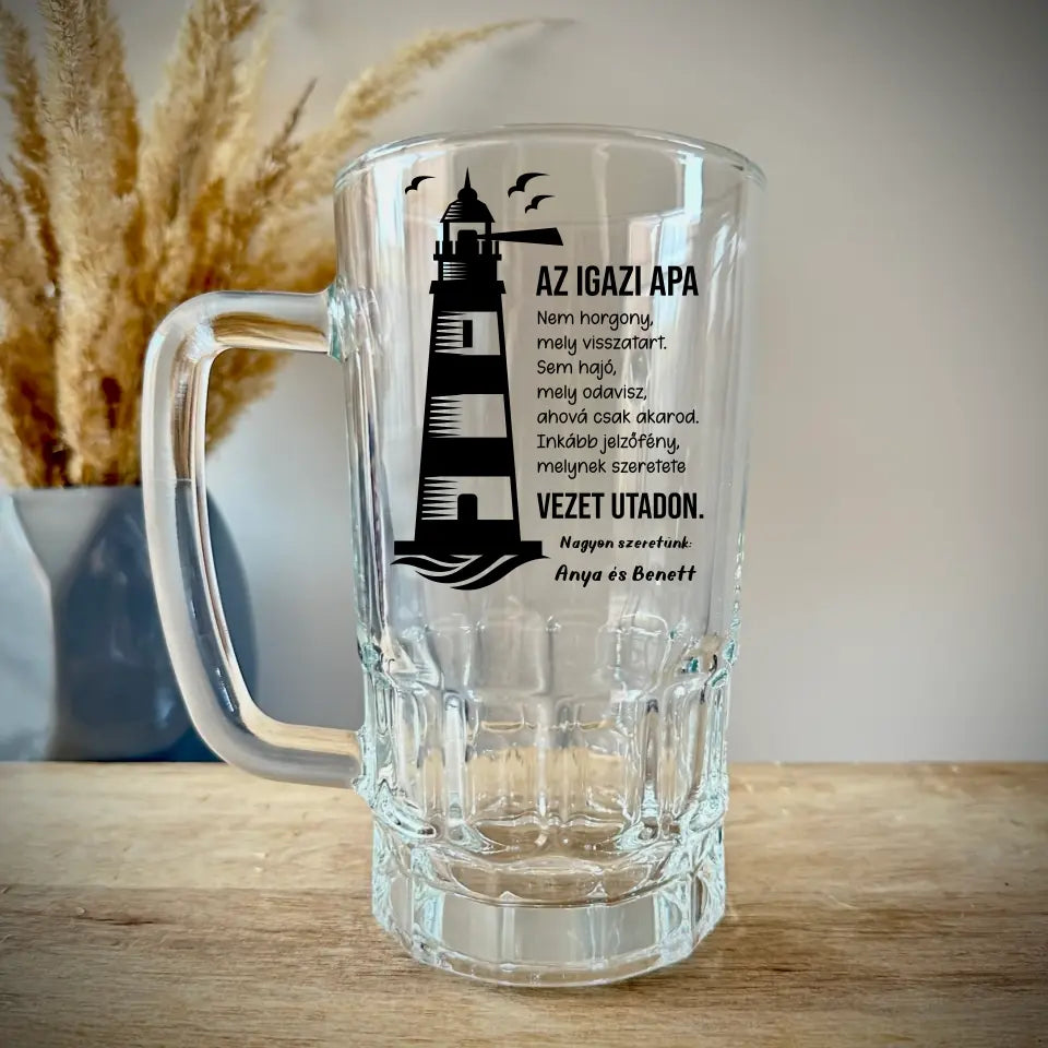 Az egyedi söröskorsóra a következő megható idézet kerül: "Az igazi apa nem horgony, mely visszatart. Sem hajó, mely odavisz, ahová csak akarod. Inkább jelzőfény, melynek szeretete vezet utadon.". Rákerülnek még az általad megadott nevek és szöveg is.