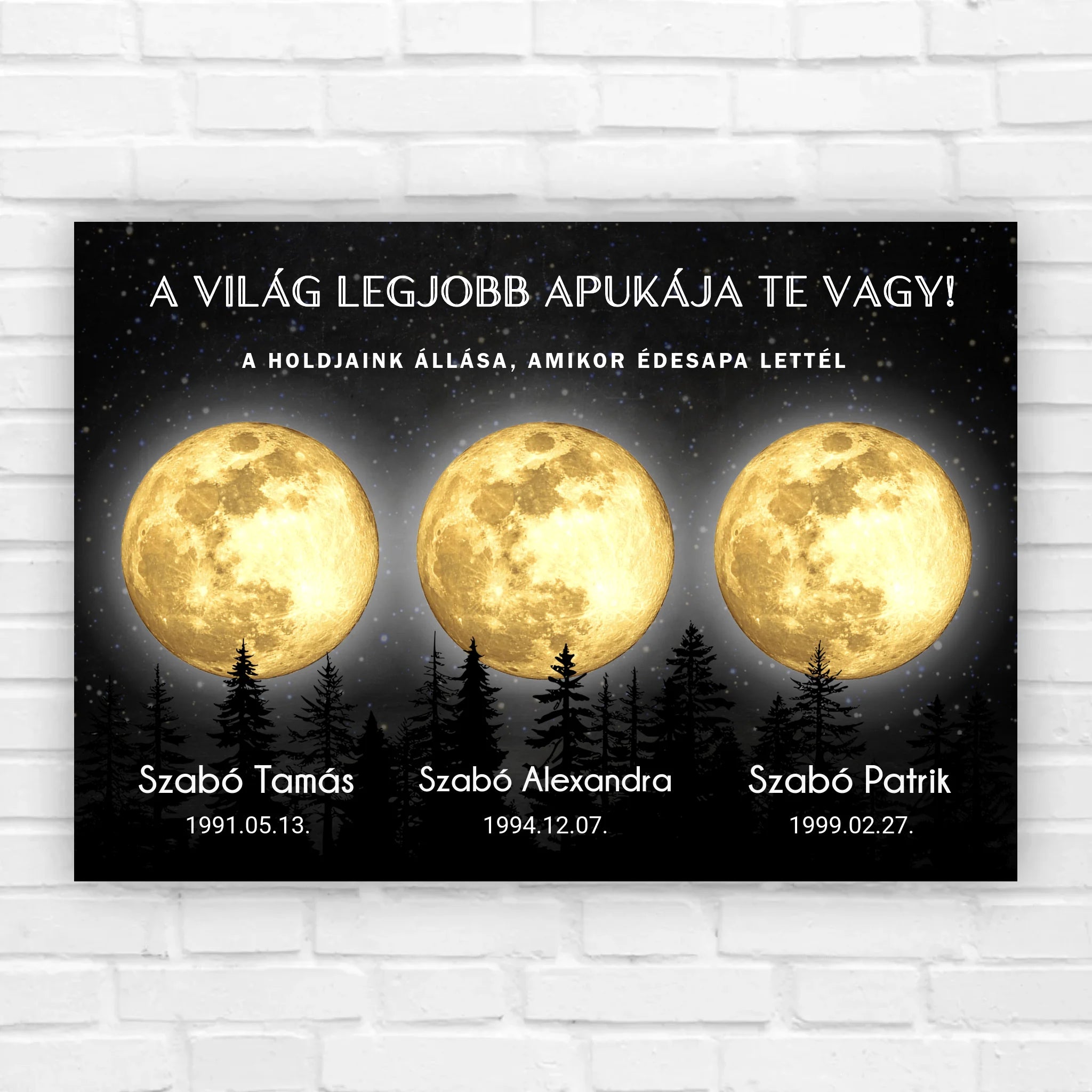 Közeleg az apák napja, vagy az édesapád születésnapja? Esetleg karácsonyi ajándékot keresel számára? Lepd meg őt egy csodálatos Holdfázis képpel, amelyen a gyermekek születéséhez kötött valós holdállások szerepelnek. Hát nem különleges? A képen összesen három gyermek adatai férnek el. Vagy kérheted úgy is, hogy két gyermek és az édesapa