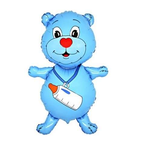 Nagy méretű, kék színű és maci alakú fólia lufi. A mackó kezében üveggel. Bájos party kellék babaváró, vagy babaköszöntő bulikra.