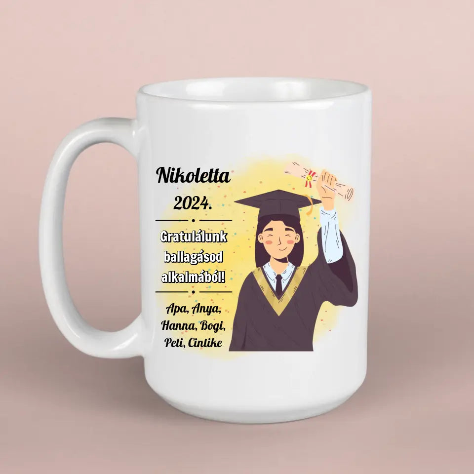 A bögre alapszíne fehér. A tetejére az általad megadott név és dátum kerül. A bögrén, sárga színű háttéren egy ballagó lány figurája látható, aminek kiválaszthatod a hajszínét. Az ajándékra megadhatod még azok neveit is akik ajándékba adják a bögrét a ballagó lánynak, illetve rákerül még az általad megadott egyedi szöveg is.