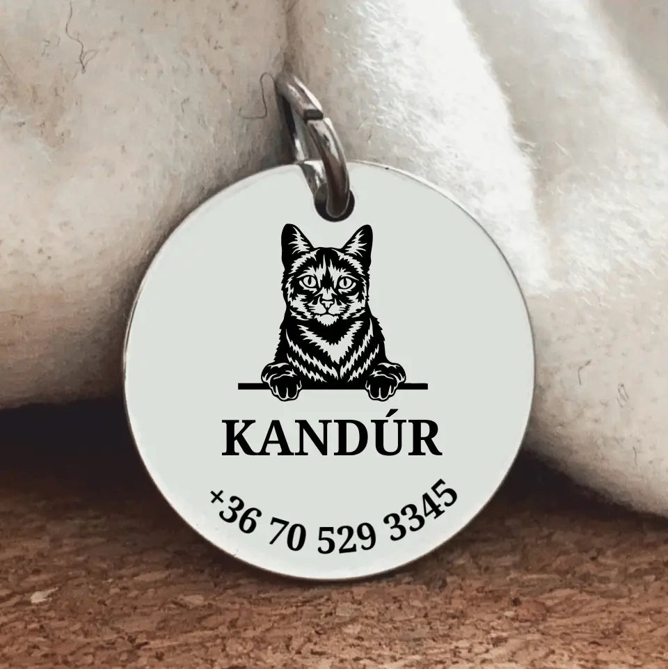 Kisállat biléta Házi cicafajta számára. A kiskedvenc nevével ellátva, cica grafikával díszítve. A medál alján a gazdi telefonszáma szerepelhet. Kérheted két oldalas gravírozással is, úgy a cica otthonának címe is felkerülhet a bilétára.