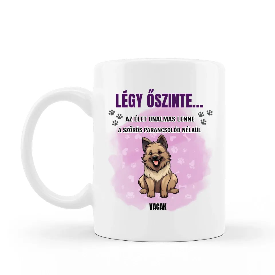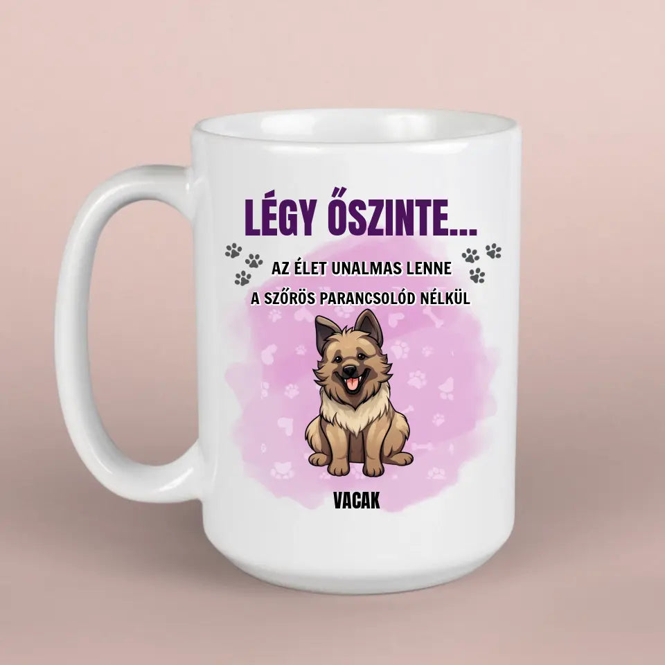A fehér színű bögrére az általad megadott nevek kerülnek. A figurák kinézetét kedved szerint, teljesen személyre tudod szabni. Sok-sok kutya és cica típusból tudsz válogatni, akár 4 kiskedvenc is választható. A bögrén a „Légy őszinte… Az élet unalmas lenne a szőrös parancsolód nélkül.” felirat szerepel, ezt a szöveget olvasva biztosan felnevet majd az ajándékozott.