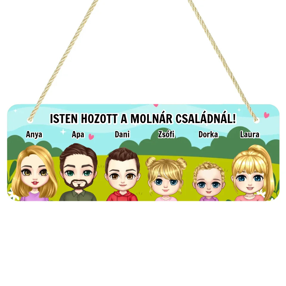 Fa anyagú, téglalap alakú, családos ajtódísz. Rajta az általad kért szöveggel, a családtagok neveivel és a rájuk hasonlító figurákkal. A karakterek teljesen személyre szabhatóak. Akár 6 családtag is elfér a díszen. Csodás dekorációs elem és szívet melengető ajándék ötlet.