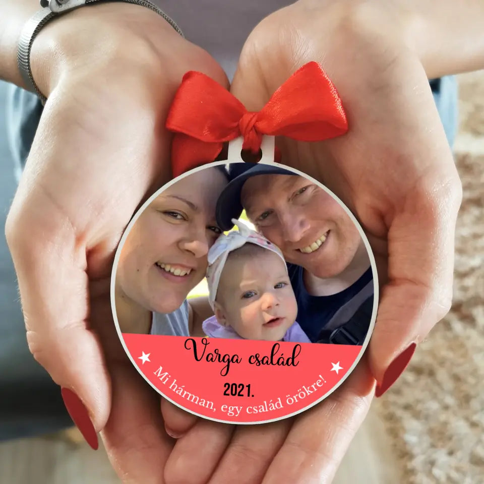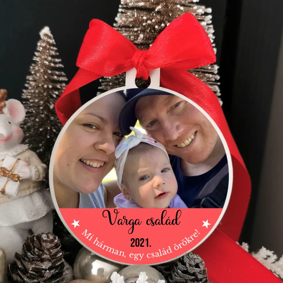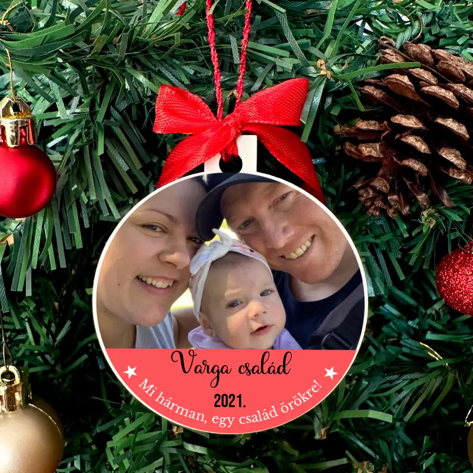 Fa anyagú, kör alakú szublimált karácsonyfadísz. Saját fényképpel, a család nevével és egy kedves szöveggel ellátva. A tetején piros színű selyemszalag díszeleg, illetve akasztót is adunk hozzá, hogy egyszerűen feltudd függeszteni a karácsonyfára. Remek kiegészítő ajándék lehet a karácsonyi főajándék mellé. Lepd meg vele a nagyikat, a keresztszülőket. Kérj rá bármilyen fotót. Akár családit, gyerkőcöset, vagy kutyusosat.