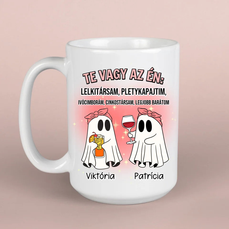 Cuki, halloweeni bögre, rajta két szellemmel, vicces szöveggel és a saját nevetekkel. Ha szereted a kávét, és a halloweent, akkor ennek a bögrének ott a helye a Te polcodon is. Lepd meg vele a legjobb barátnődet és fogyasszátok ebből a kedvenc kávétokat.