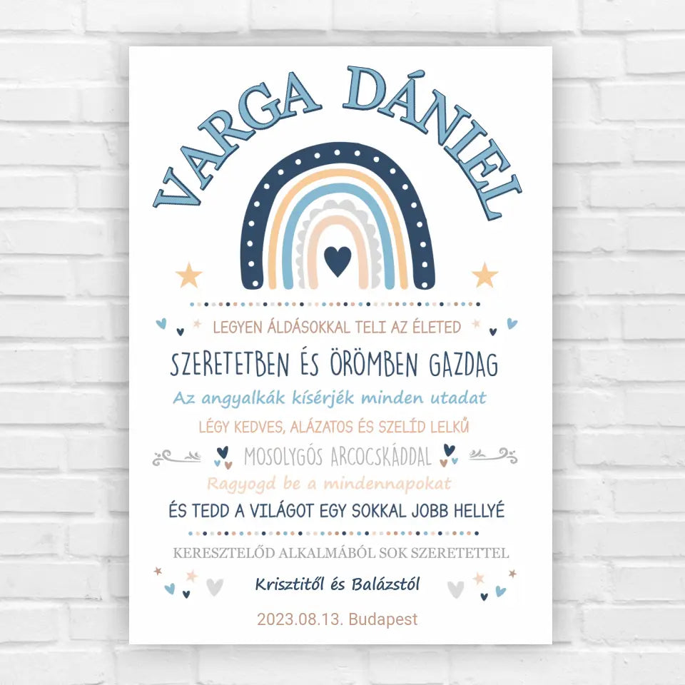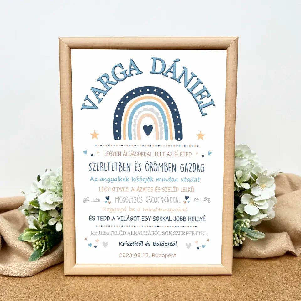 Szívet melengető szöveggel láttuk el a legújabb képünket, amely egy különleges keresztelő ajándék lehet egy szerettednek. A képre rákerül a gyermek neve, a keresztelő dátuma és helyszíne, valamint az is, hogy kiktől kapja az ajándékot. A képen szereplő szövegek nem változtathatóak!