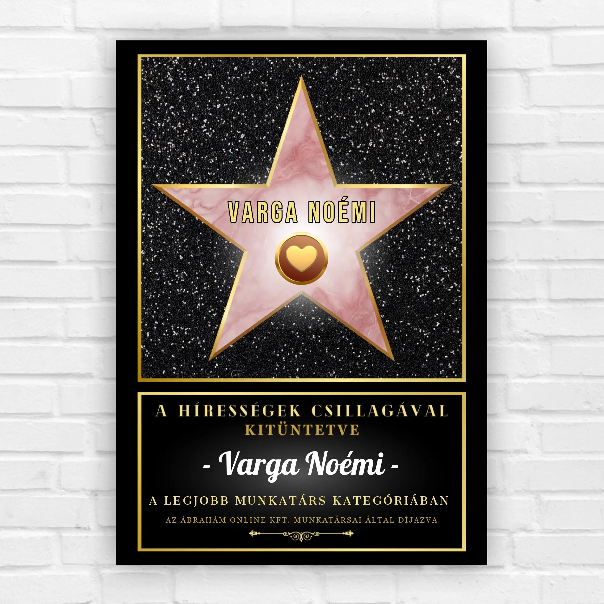 A képre rákerül a híresség, azaz az ajándékozott neve és az általad megadott feliratok. Az egész kép egy díjként fog kinézni, amelyet egy jeles alkalom után átnyújthatsz a szerettednek. Most már neki is lehet saját Hollywoodi csillaga.
