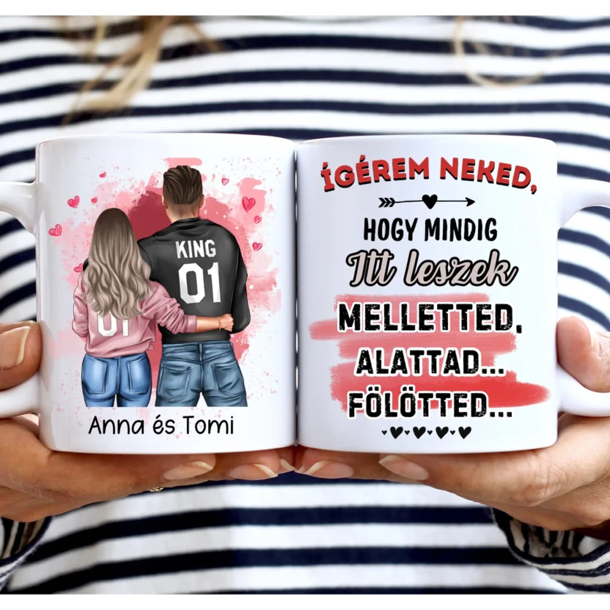 A bögre alapszíne fehér, rajta két ölelkező figura látható, melyeket teljesen személyre tudod szabni. Kiválaszthatod a figurák színét, a hajuk színét és annak formáját, a ruhájukat is teljesen átformálhatod. A bögrén az alábbi feliratot olvashatod: „Szeretlek ma, holnap és mindörökké…”, ezen kívül még az általad megadott nevek is felkerülnek rá.