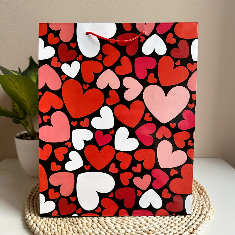 Romantikus, nagy méretű, szívecskés ajándéktasak pároknak. Meggypiros színű zsinórfülekkel. A tasak eleje, hátulja és oldala szívecskék százaival van borítva. A színvilágot tekintve a fehér,a piros, a rózsaszín, a fekete és a bordó színek egy igazi romantikus és szenvedélyes külsőt kölcsönöznek a tasaknak. Ha ezt választod a kedvesed ajándékának csomagolásaként, akkor biztos lehetsz benne, hogy már a látványától is elolvad majd. Az ölelés és a puszi 100%-ig garantált.