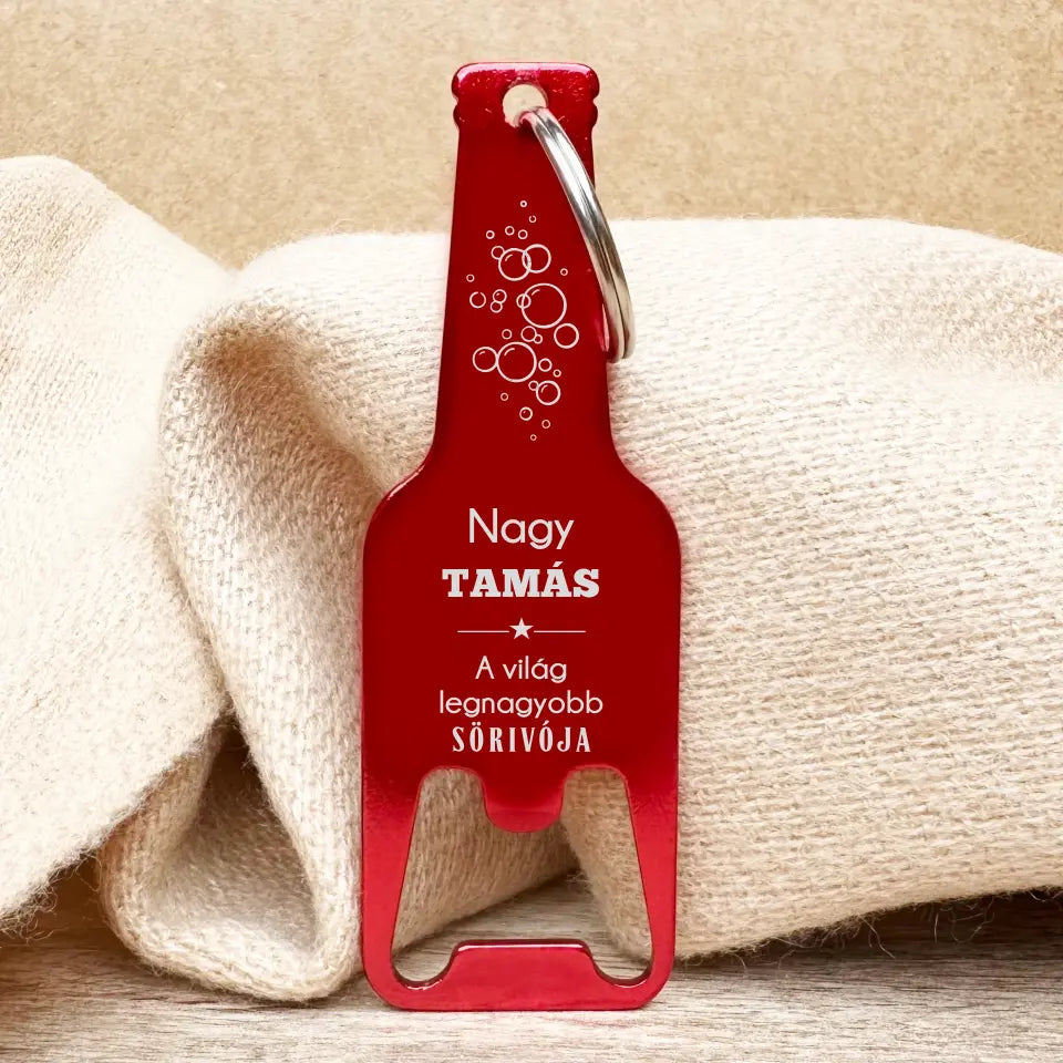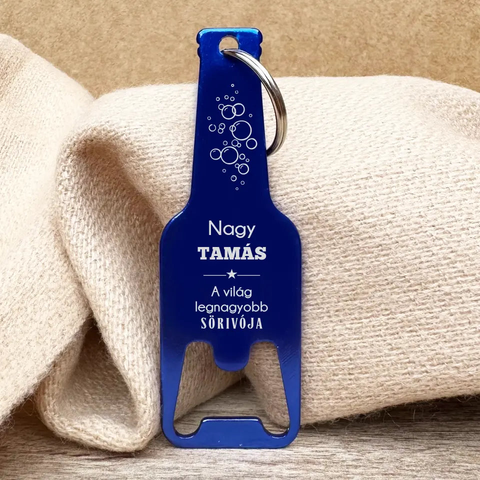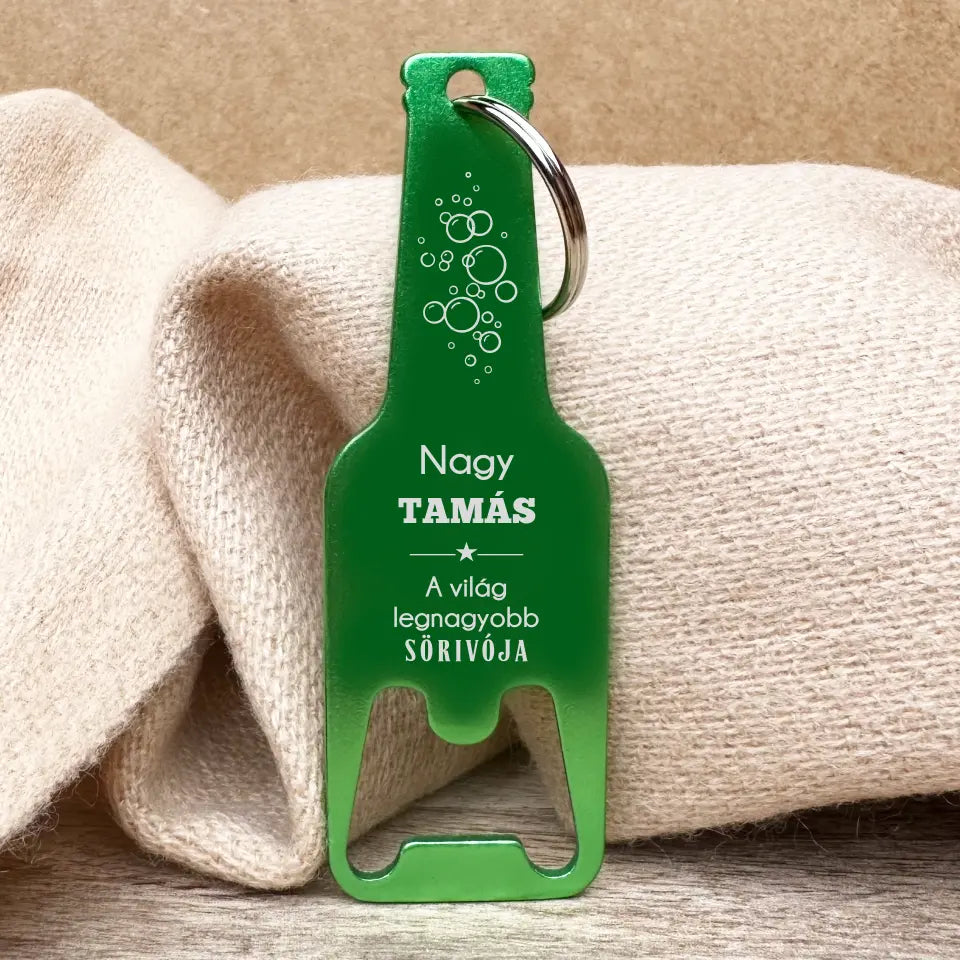 Alumínium, sörösüveg formájú, egyedi sörnyitó, amelyet az általad kért névvel gravírozunk meg. A nyitón a neven kívül az alábbi felirat olvasható: "A világ legnagyobb sörivója". Akár kulcstartóként is használható, így mindig kéznél lesz, ha épp egy jó üveg sört kellene felbontani. Három színben választható: fekete, sötétkék, vagy ezüst színű. Az ezüst színű verzión a felirat sötétszürke színben fog szerepelni a nyitón, a fekete és a kék változatban, pedig fehér színűn.