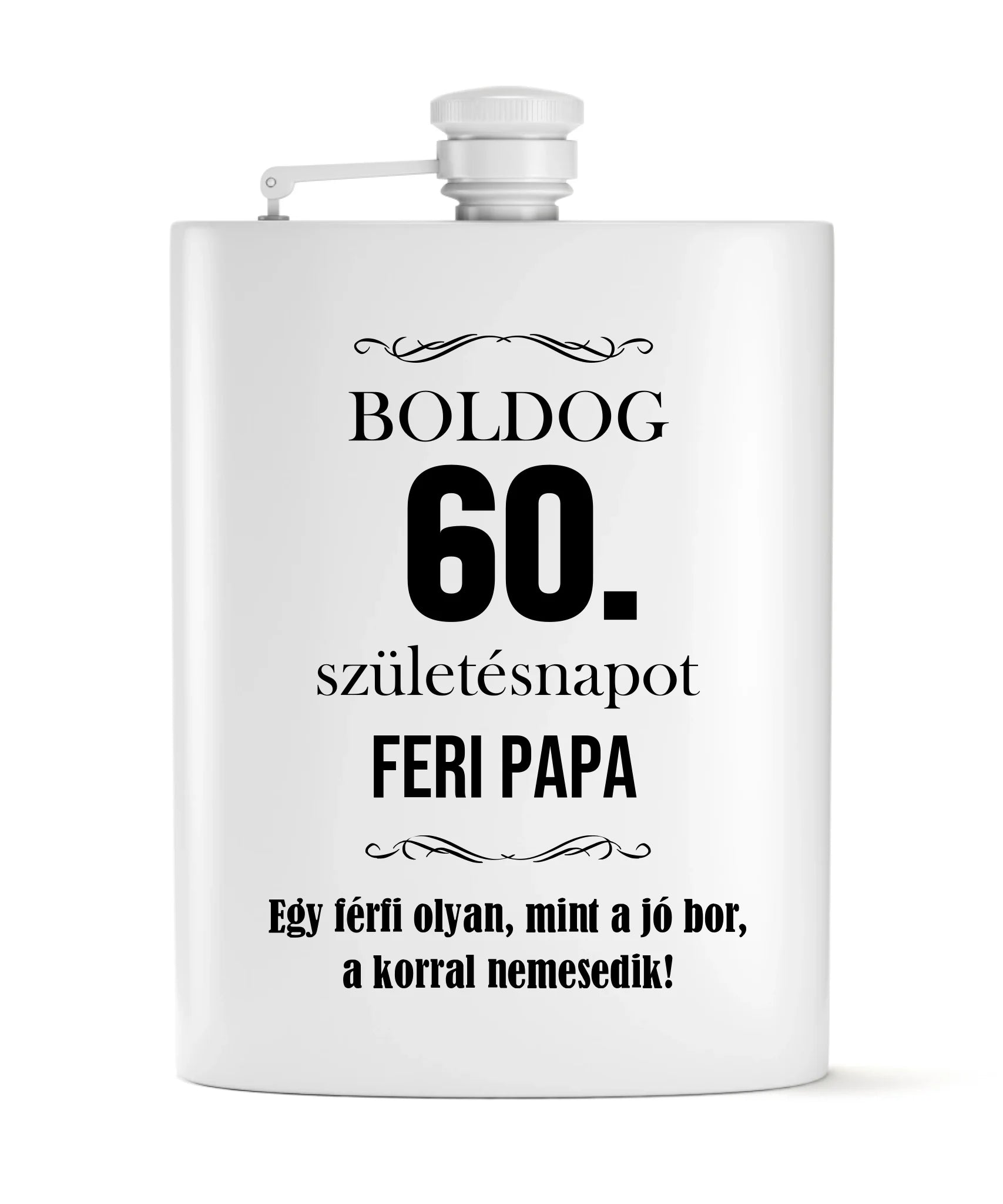 A férfiaknak szóló, 60 éves szülinapi ajándék ötlet egy darab feliratos laposüveget, 2 db acél poharat és egy darab utántöltő tölcsért tartalmaz. Értékes és egyben vicces ajándék.  A flaskára megadhatod az ajándékozott nevét, így teljesen személyre szóló ajándékot tudsz neki átadni. Az ajándékozott biztosan oda lesz érte és minden alkalommal, amikor iszik a flaskából, eszébe jut, hogy kitől kapta.