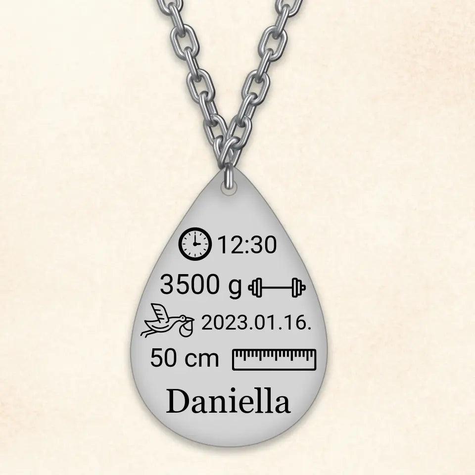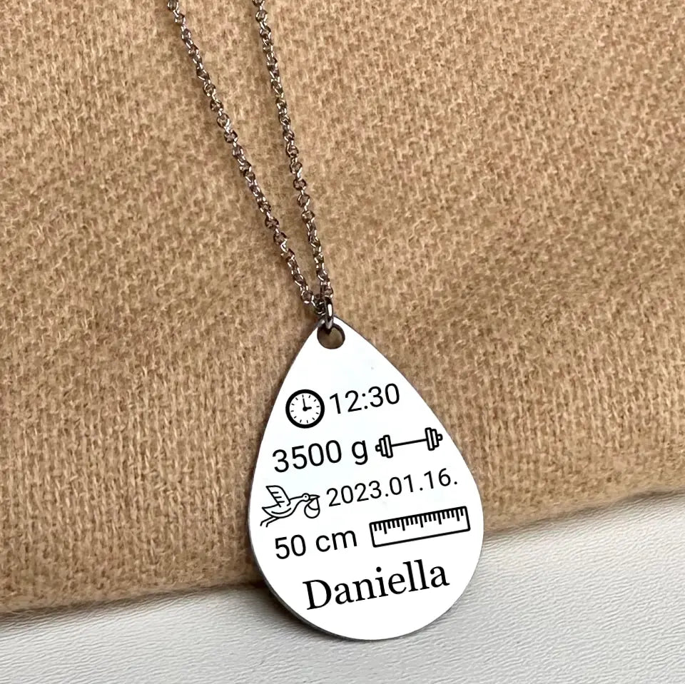 Tekintetet vonzó, meseszép baba emlékőrző nyaklánc. Acél csepp alakú medállal. Az emlékőrzőre a baba keresztnevét és a születési adatait gravírozzuk. A feliratos ékszert rózsakvarc ásvány és acél gyöngy díszíti. Add ajándékba Anyák napjára, vagy lepd meg egy baba emlékőrzővel a nagymamát.