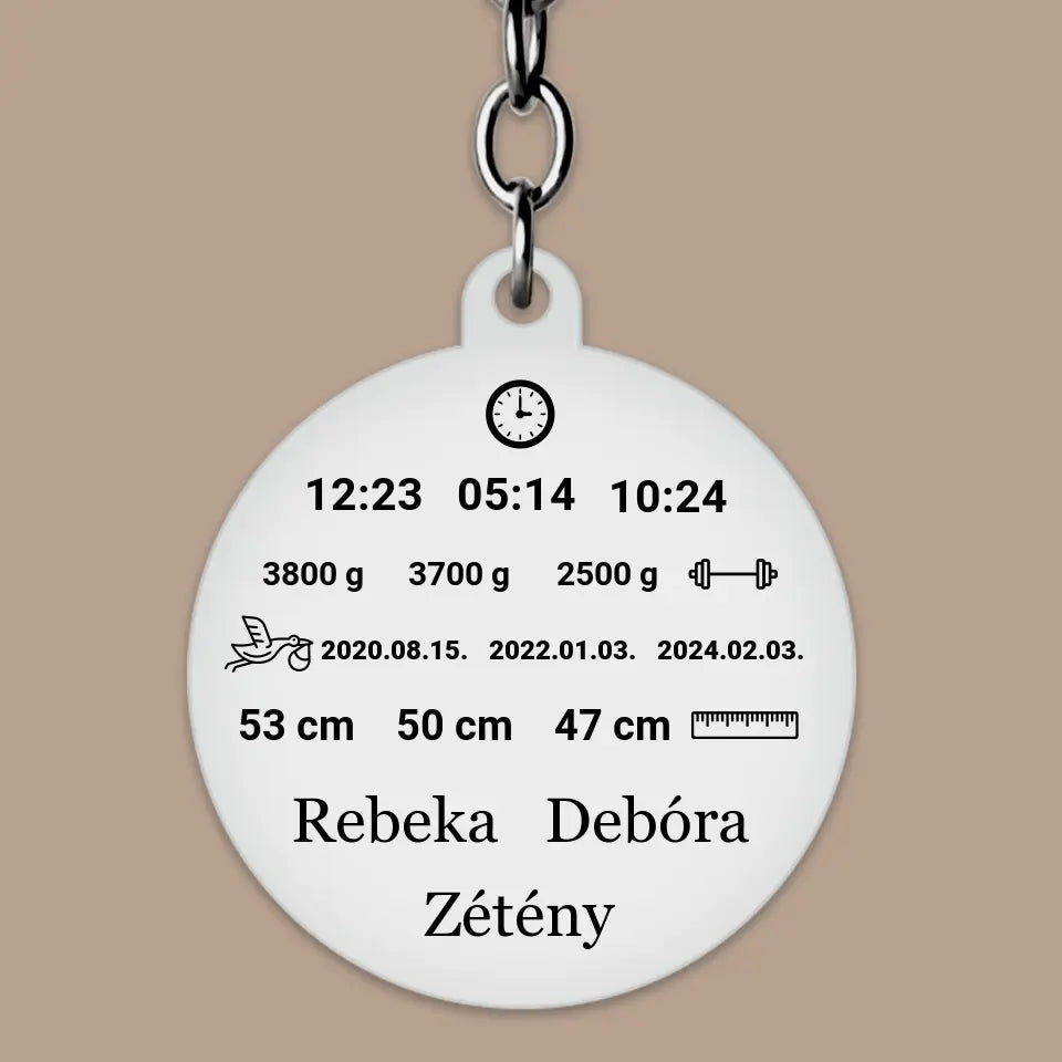A 3 gyermekes baba emlékőrző kulcstartó pontosan ezt az örömet zárja magába. Három gyönyörű gyermek születésének boldog pillanatait. Ha rápillantasz, mindig eszedbe fog jutni, amikor először tartottad őket a karodban és mindig örömmel fog megtelni a szíved, mert nagyon szereted őket.