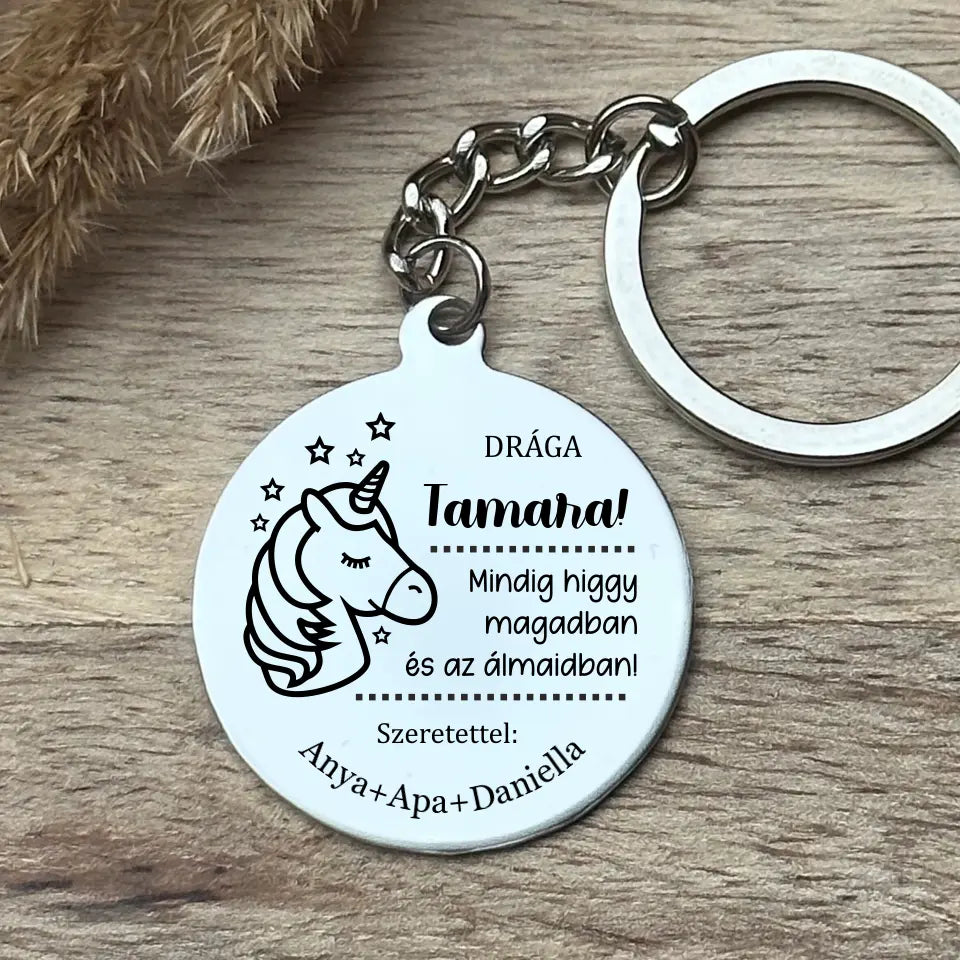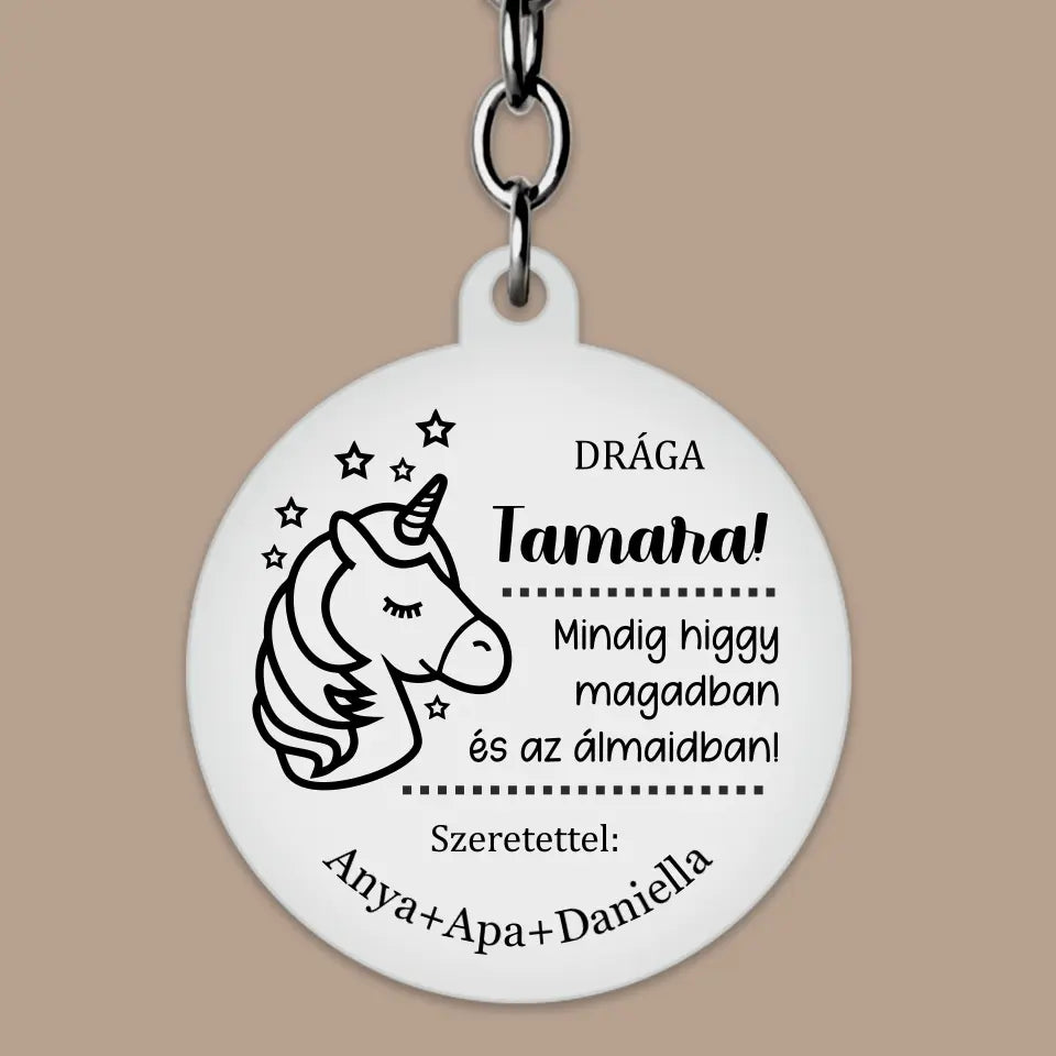 Bájos unikornisos kulcstartó, amelyre a saját nevedet és az alábbi szöveget gravírozzuk: "Mindig higgy magadban és az álmaidban!" A medál aljába az ajándékozók nevei kerülnek. Remek születésnapi, ballagási, vagy névnapi ajándék egy unikornis imádó lánynak.