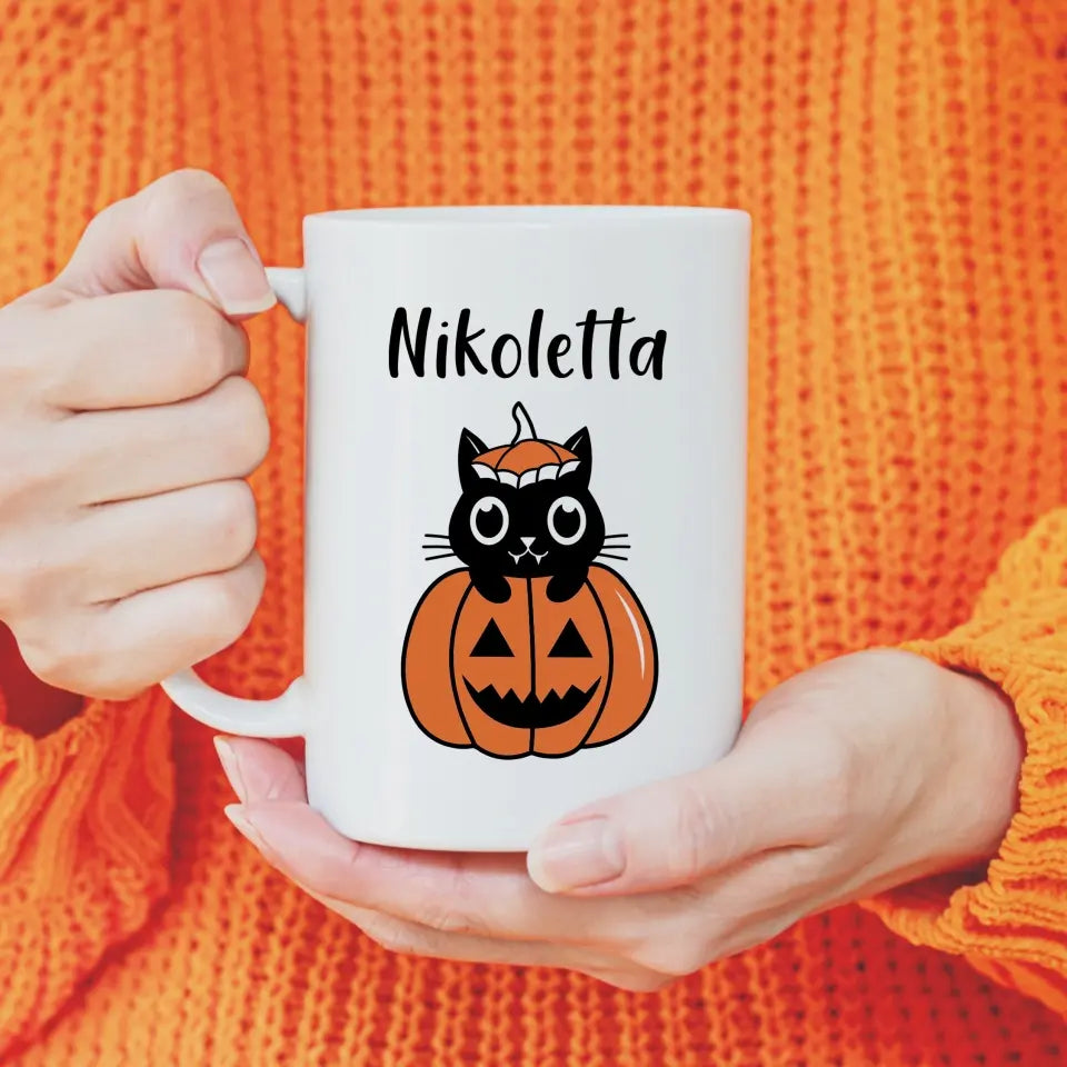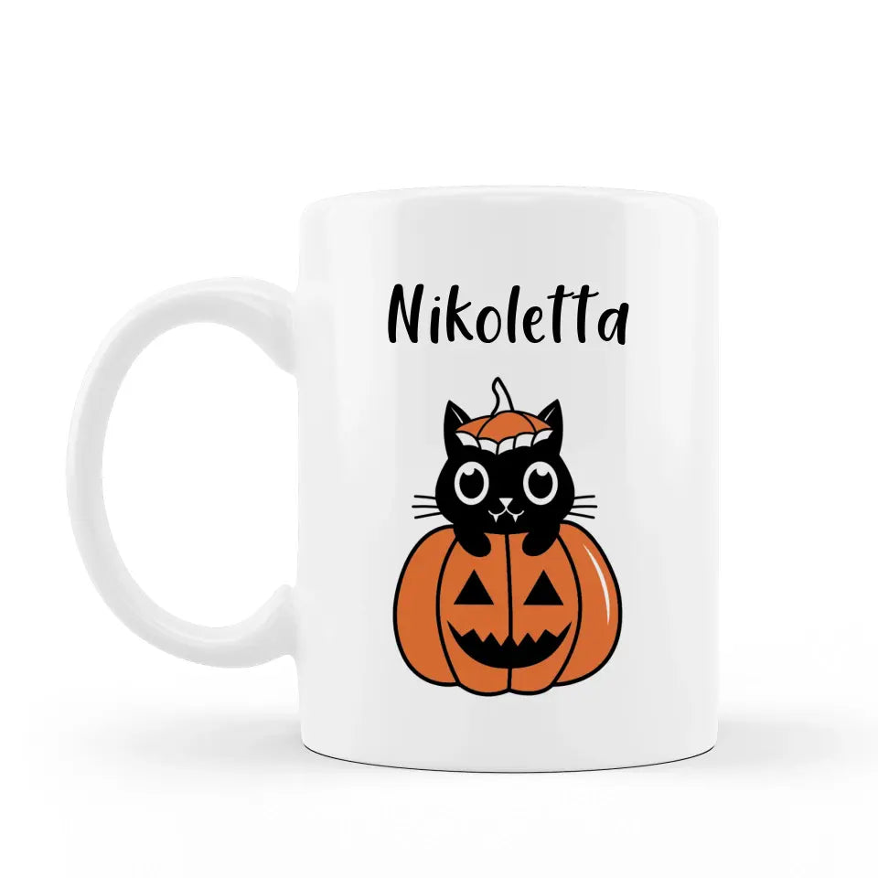 Halloweeni bögre, rajta egy cicával és a Te neveddel. Ha szereted a teát, és a halloweent, akkor ennek a töklámpásos bögrének ott a helye a Te polcodon is. A feliratmezőbe add meg a nevet, amit szeretnél a bögrén látni!