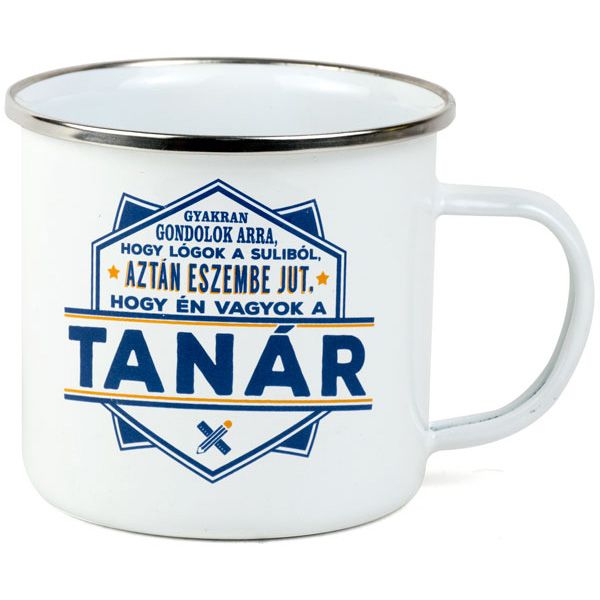 Fehér színű, fehér belsejű, kék és narancs feliratos fém anyagú bögre tanárok részére. A bögre elején és a hátulján az alábbi felirat olvasható: "Gyakran gondolok arra, hogy lógok a suliból, aztán eszembe jut, hogy én vagyok a TANÁR." Lepd meg vele az osztályfőnököt, vagy egy szívednek kedves tanárodat. Tökéletes ajándék ballagásra, vagy pedagógusnapra.