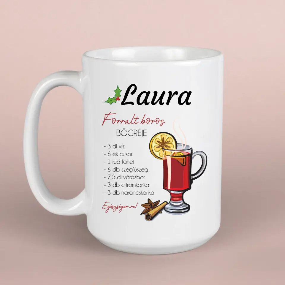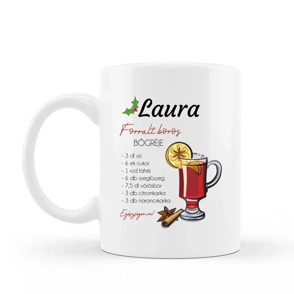 Édes, névre szóló forralt boros bögre, a téli napok felpörgetésére. Ki ne szeretné ezt a helyes bögrét szorongatni a hideg napokon? Töltsd meg forró borral, és kuckózz be vele elolvasni egy jó könyvet, vagy megnézni a kedvenc filmjeidet. A bögrén a neven és a forralt bor grafikán kívül még egy recept is olvasható. Így ha a tulajdonosának ahhoz van kedve, hogy igyon egy jó kis forralt bort, akkor elegendő a hozzávaló bögrét elővenni és elkészíteni a rajta olvasottakat.