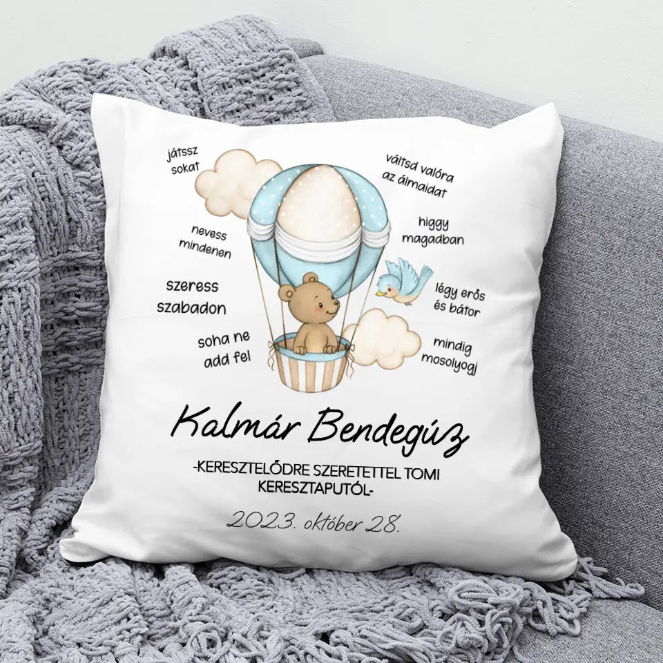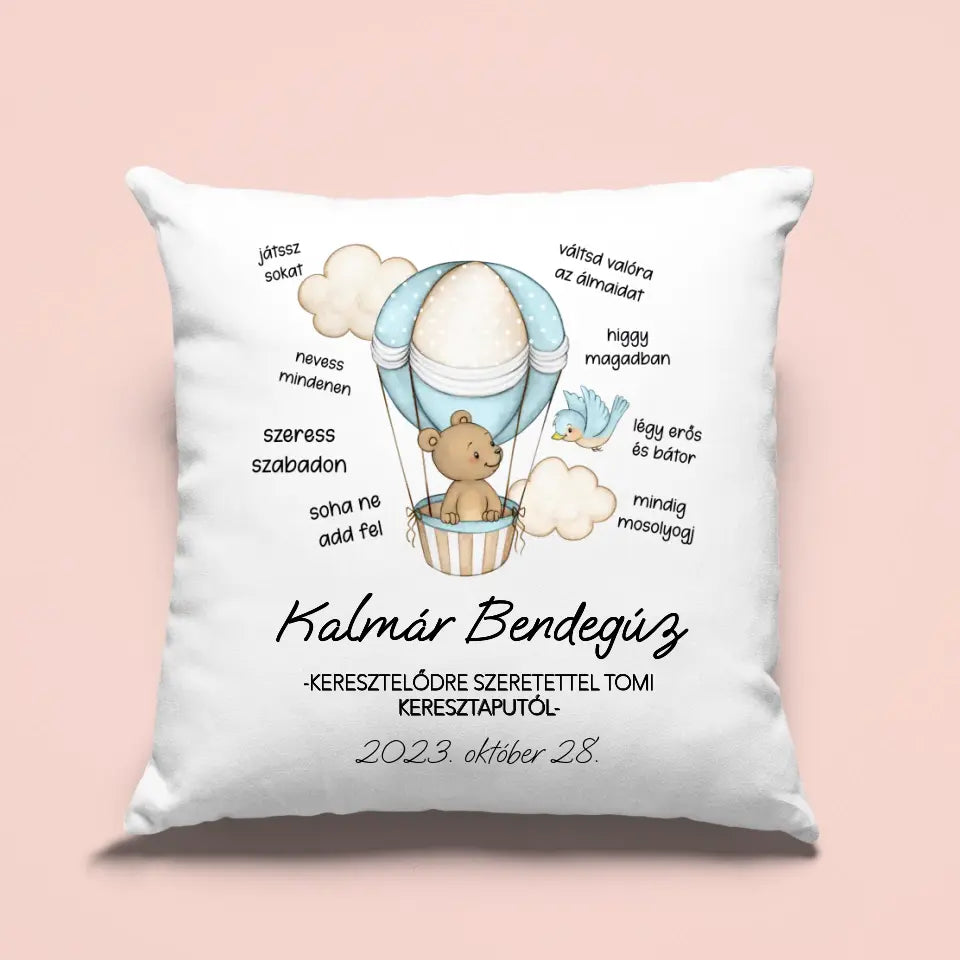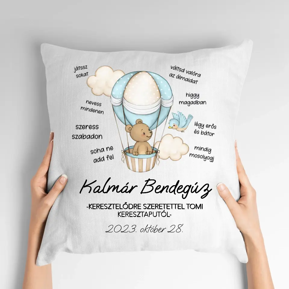 Bájos és kedves keresztelői ajándék. A párnára rákerül a kisfiú neve, a keresztelő dátuma, az ajándékozó neve és sok-sok jókívánság. A babaszoba éke lehet ez a párna és később kedves emlék maradhat a keresztelő napjáról.