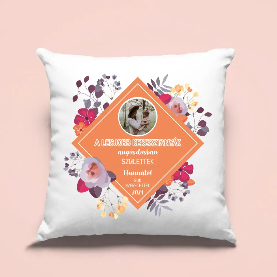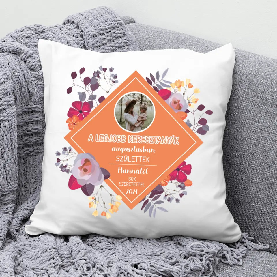 Fehér alapon, narancssárga mintájú párna, rajta a keresztanya fényképével. Lepd meg őt a születésnapján. Biztos vagyok benne, hogy nagyon örülne egy ilyen bájos lakásdekorációnak.