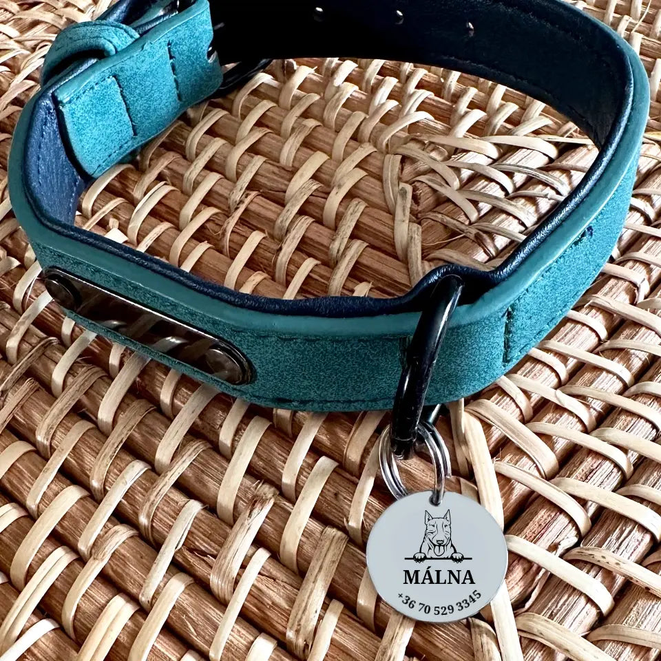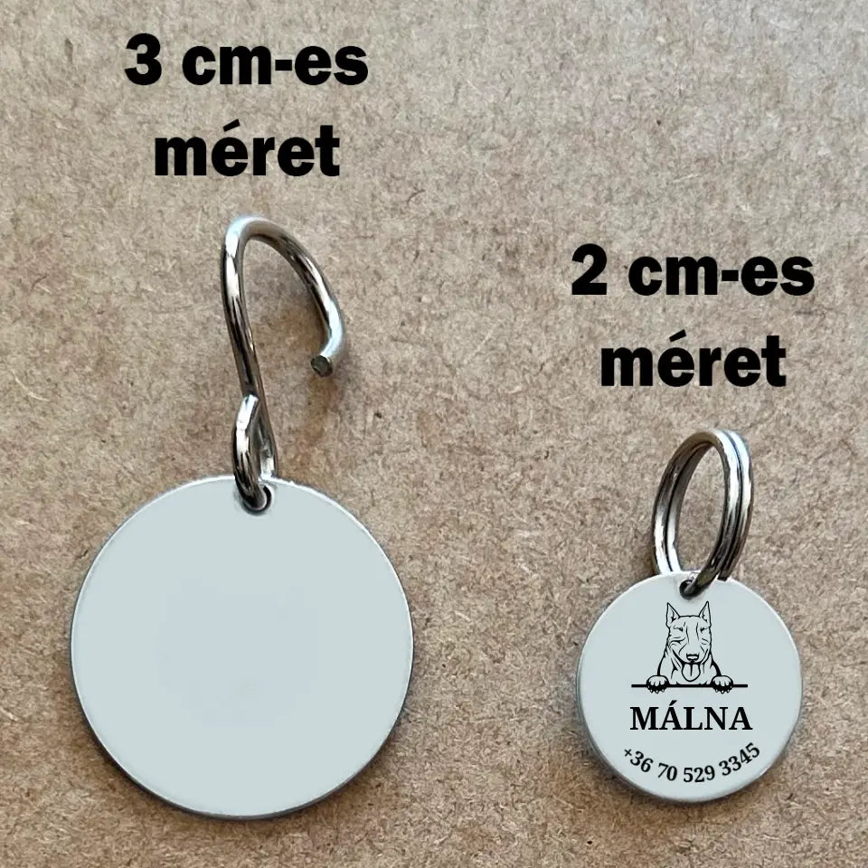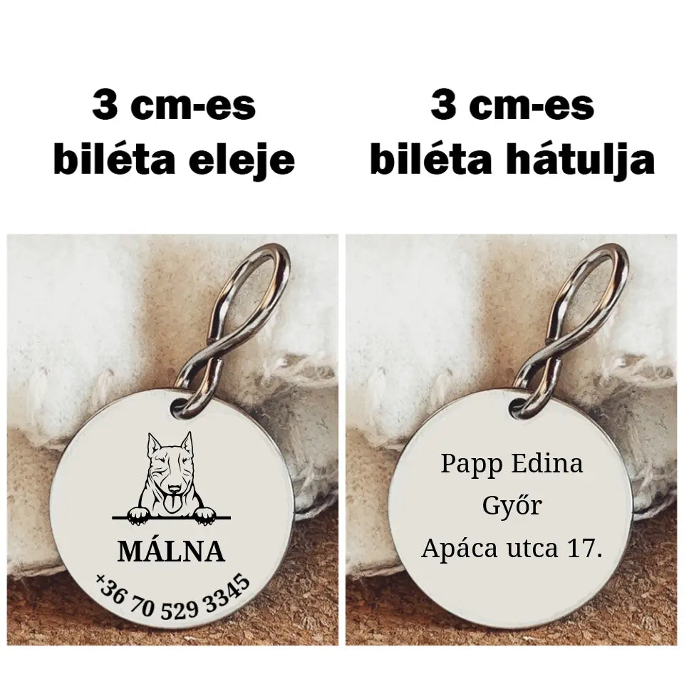 Egyedileg gravírozott kutya biléta Bull terrier fajtájú kutyáknak. A biléta közepére egy Bull terrier kutya grafikáját gravírozzuk, alá, pedig a kedvenc neve, vagy beceneve kerülhet. A  nemesacél medál aljába a gazdi számát írjuk, de ha szeretnéd rákerülhet a címed is, vagy pedig két telefonszám. A medál anyaga nemesacél, így a kedvenc nem tudja elrágni, vagy kárt tenni benne. A bilétát masszív "S" kampóval készítjük. A nyakörvre fogó, vagy egyéb eszköz segítségével helyezhető fel. A biléta ideális méretű, nem zavaró a hordása. Cuki ajándék a blökinek és boldogság a gazdinak. Legyen biztonságban a Te kutyusod is! Ez a biléta minden kutyaimádó álma.