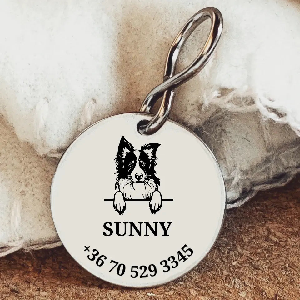 Lézergravírozással készült, egyedi kutya biléta border collie kutyusnak. A biléta közepére egy border collie kutya grafikáját gravírozzuk, alá, pedig a kedvenc neve, vagy beceneve kerülhet. A nemesacél medál aljába a gazdi számát írjuk, de ha szeretnéd rákerülhet a címed is, vagy pedig két telefonszám. A medál anyaga nemesacél, így a kedvenc nem tudja elrágni, vagy kárt tenni benne. A bilétát masszív "S" kampóval készítjük. A nyakörvre fogó, vagy egyéb eszköz segítségével helyezhető fel. A biléta ideális méretű, nem zavaró a hordása. Cuki ajándék a blökinek és boldogság a gazdinak. Legyen biztonságban a Te kutyusod is! Ez a biléta minden kutyaimádó álma.