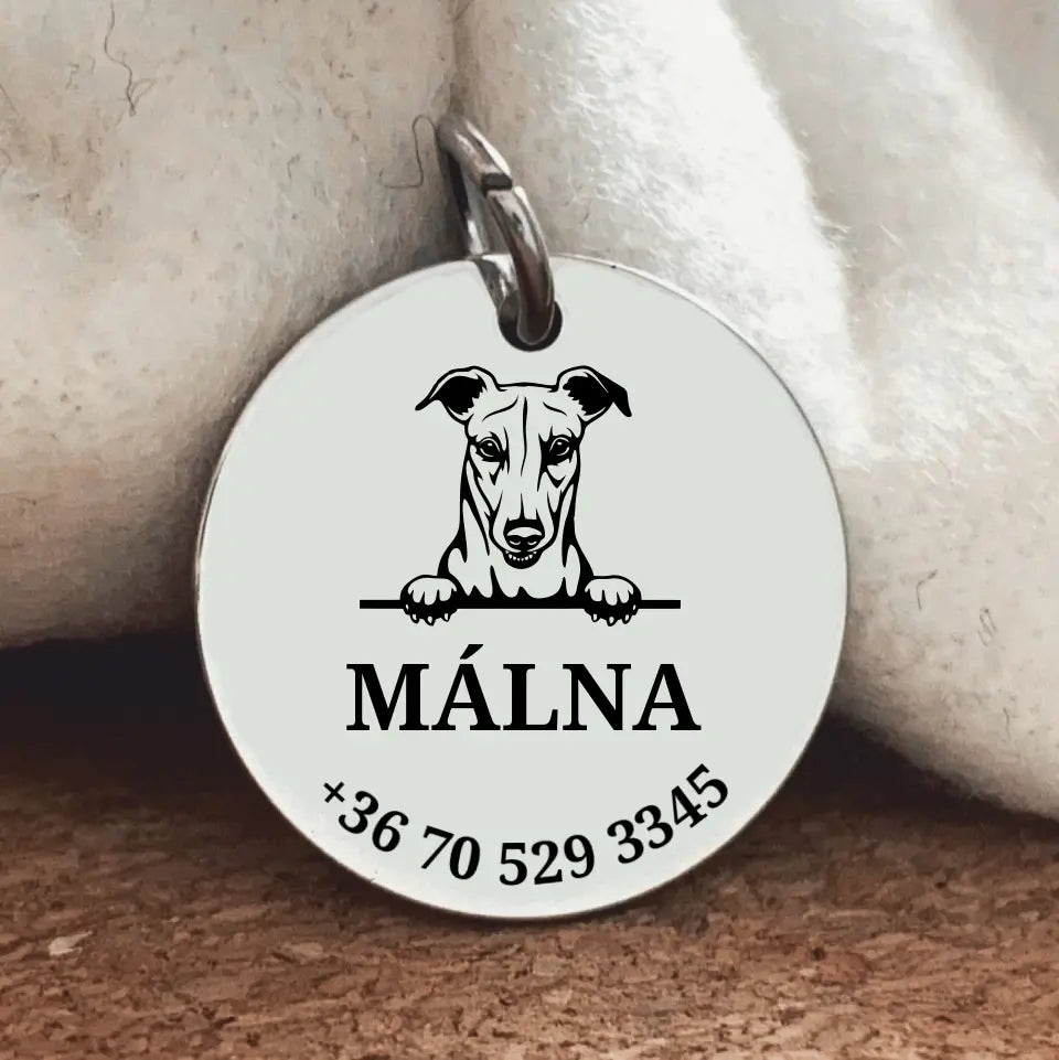 Lézergravírozással készült, egyedi kutya biléta Agárnak. A biléta közepére egy Agár kutya grafikáját gravírozzuk, alá, pedig a kedvenc neve, vagy beceneve kerülhet. A  nemesacél medál aljába a gazdi számát írjuk, de ha szeretnéd rákerülhet a címed is, vagy pedig két telefonszám. A medál anyaga nemesacél, így a kedvenc nem tudja elrágni, vagy kárt tenni benne. A bilétát masszív "S" kampóval készítjük. A nyakörvre fogó, vagy egyéb eszköz segítségével helyezhető fel. A biléta ideális méretű, nem zavaró a hordása. Cuki ajándék a blökinek és boldogság a gazdinak. Legyen biztonságban a Te kutyusod is! Ez a biléta minden kutyaimádó álma.