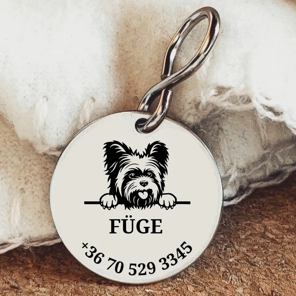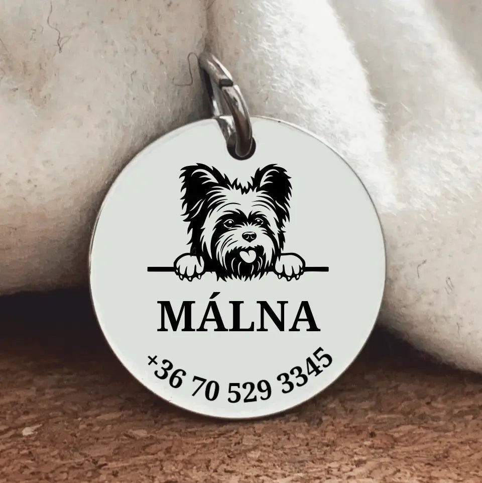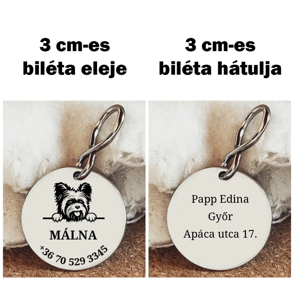 Egyedileg gravírozott kutya biléta Yorkshire fajtájú kutyáknak. A biléta közepére egy Yorkshire kutya grafikáját gravírozzuk, alá, pedig a kedvenc neve, vagy beceneve kerülhet. A nemesacél medál aljába a gazdi számát írjuk, de ha szeretnéd rákerülhet a címed is, vagy pedig két telefonszám. A medál anyaga nemesacél, így a kedvenc nem tudja elrágni, vagy kárt tenni benne. A bilétát masszív "S" kampóval készítjük. A nyakörvre fogó, vagy egyéb eszköz segítségével helyezhető fel. A biléta ideális méretű, nem zavaró a hordása. Cuki ajándék a blökinek és boldogság a gazdinak. Legyen biztonságban a Te kutyusod is! Ez a biléta minden kutyaimádó álma.