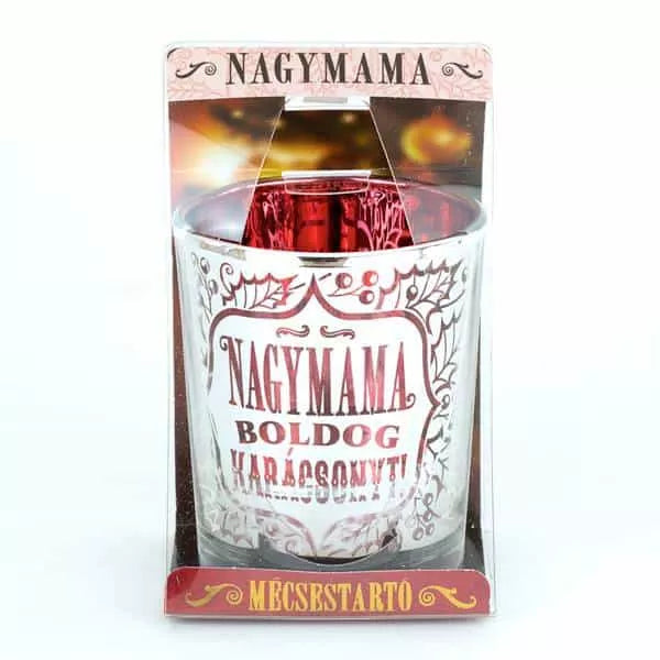 Kis méretű, ezüstösen csillogó nagymamáknak készült karácsonyi mécsestartó. A belseje gyönyörű bordó színű. A tartón az alábbi felirat olvasható: "Nagymama, Boldog Karácsonyt!" Ha meggyújtod a tartóban lévő mécsest, a felirat ragyogni fog a mécses fényében. Igazán meghitt és ünnepi hangulatot kölcsönöz a helységnek.