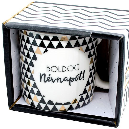 Szépséges ajándék bögre névnapra. A külsejét fekete és arany színű háromszögek díszítik. A bögre közepén, pedig egy fehér körben az alábbi felirat olvasható: „Boldog névnapot!” Ha ajándékba adod egy szerettednek, vagy barátodnak, biztosan örül majd neki és szívesen fogyasztja majd belőle a kedvenc kávéját, vagy teáját.