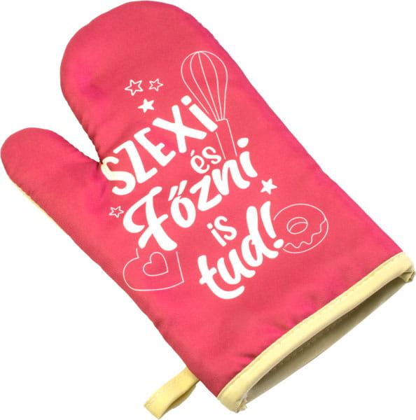 Ha szeretnéd még személyesebbé tenni az ajándékozás pillanatát, akkor tedd bele a kesztyűt egy aranyos tasakba és válasz mellé az alkalomhoz illő képeslapot, amibe bele írhatod, a gondolataidat. Ez a praktikus ajándék kialakításának köszönhetően remekül véd a hőtől a konyhában. A kesztyűn az alábbi felirat olvasható: Szexi és főzni is tud!