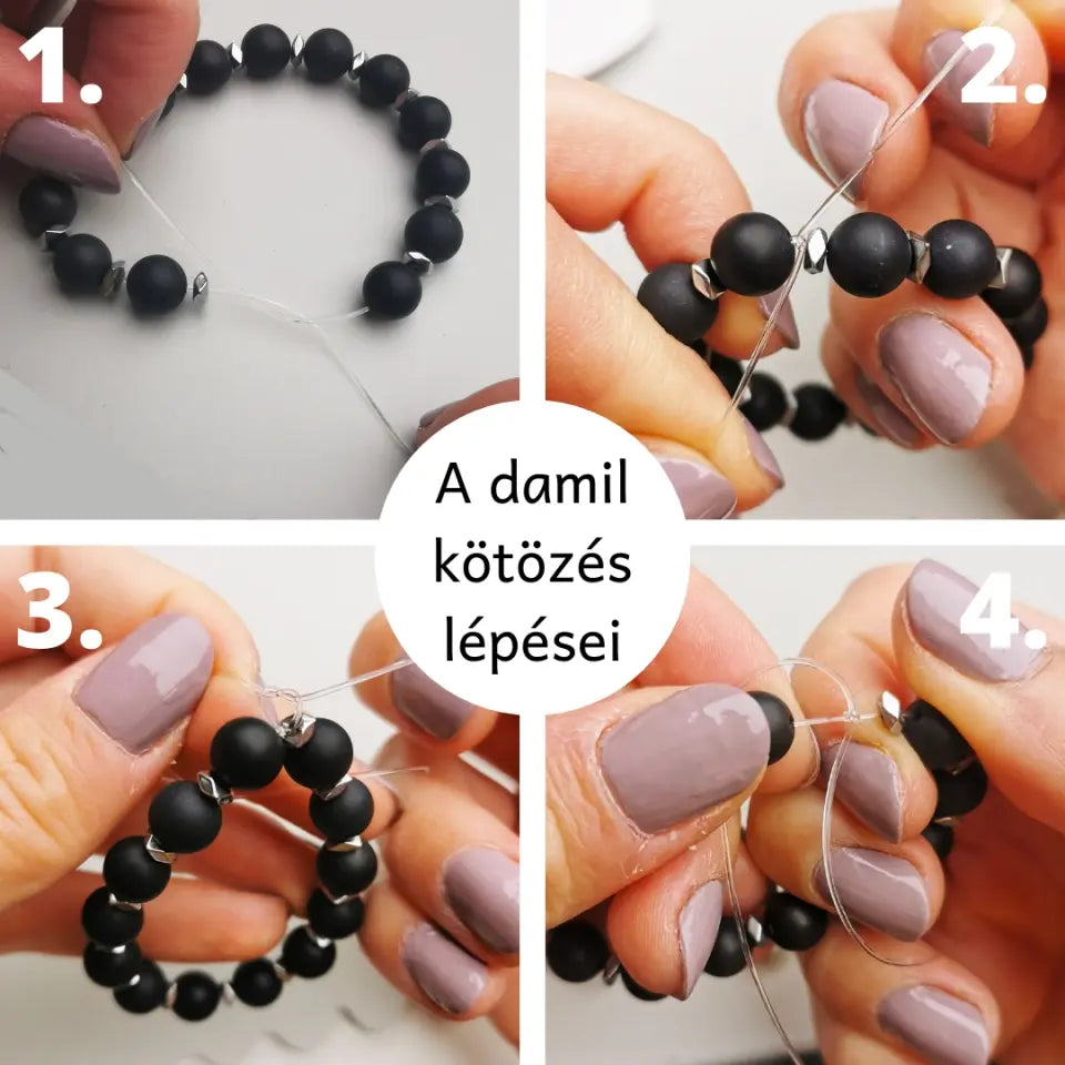 8. Ha úgy érzed, hogy lazult a damil, tehát nem elég feszes, akkor egyszerűen csak fűzd újra a teljes ékszert. (Az 1 méter damil körülbelül 3 újra fűzéshez lesz elegendő.)