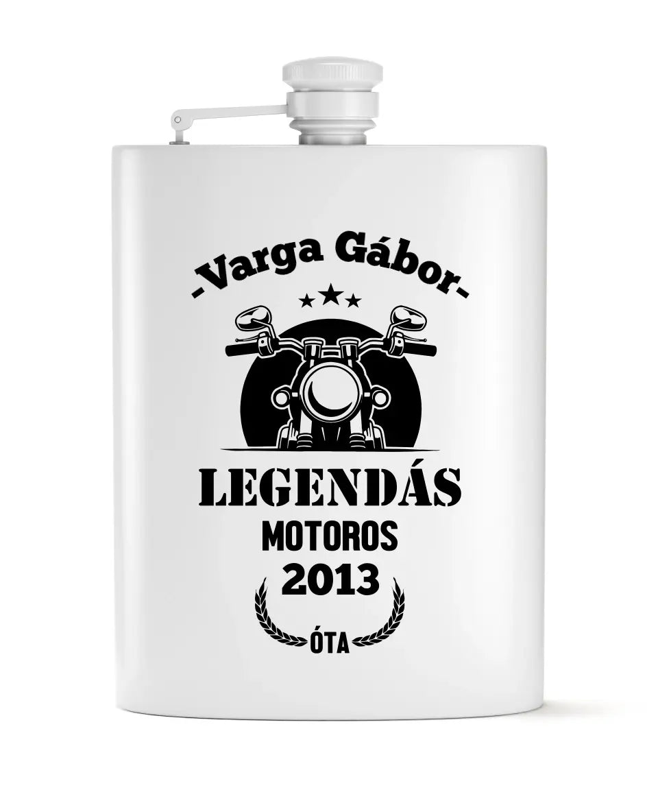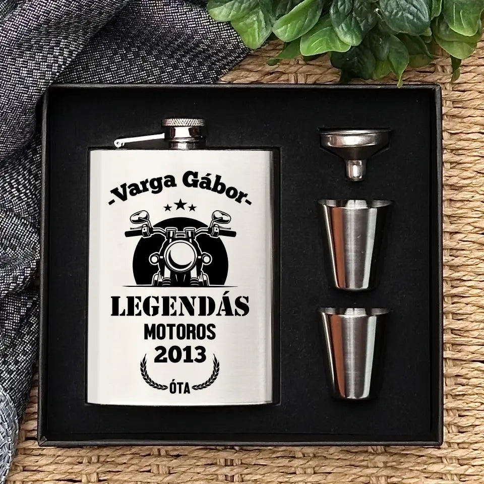 Vagány, egyedi flaskaszett, amely remek motoros ajándék fiúknak. A gravírozott ajándék szett egy darab egyedi feliratos laposüveget, 2 db acél poharat és egy darab utántöltő tölcsért tartalmaz. Igazi menő, értékes ajándék ötlet férfiak számára. A flaskára megadhatod a nevet és az évszámot, amióta az ajándékozott motorozik. Az ajándékozott biztosan oda lesz érte és minden alkalommal, amikor iszik az üvegből, eszébe jut, hogy kitől kapta.