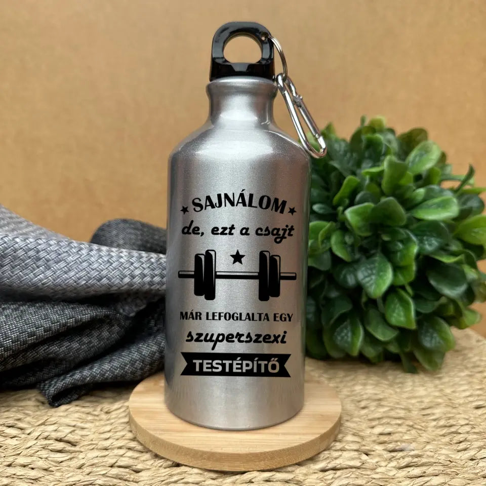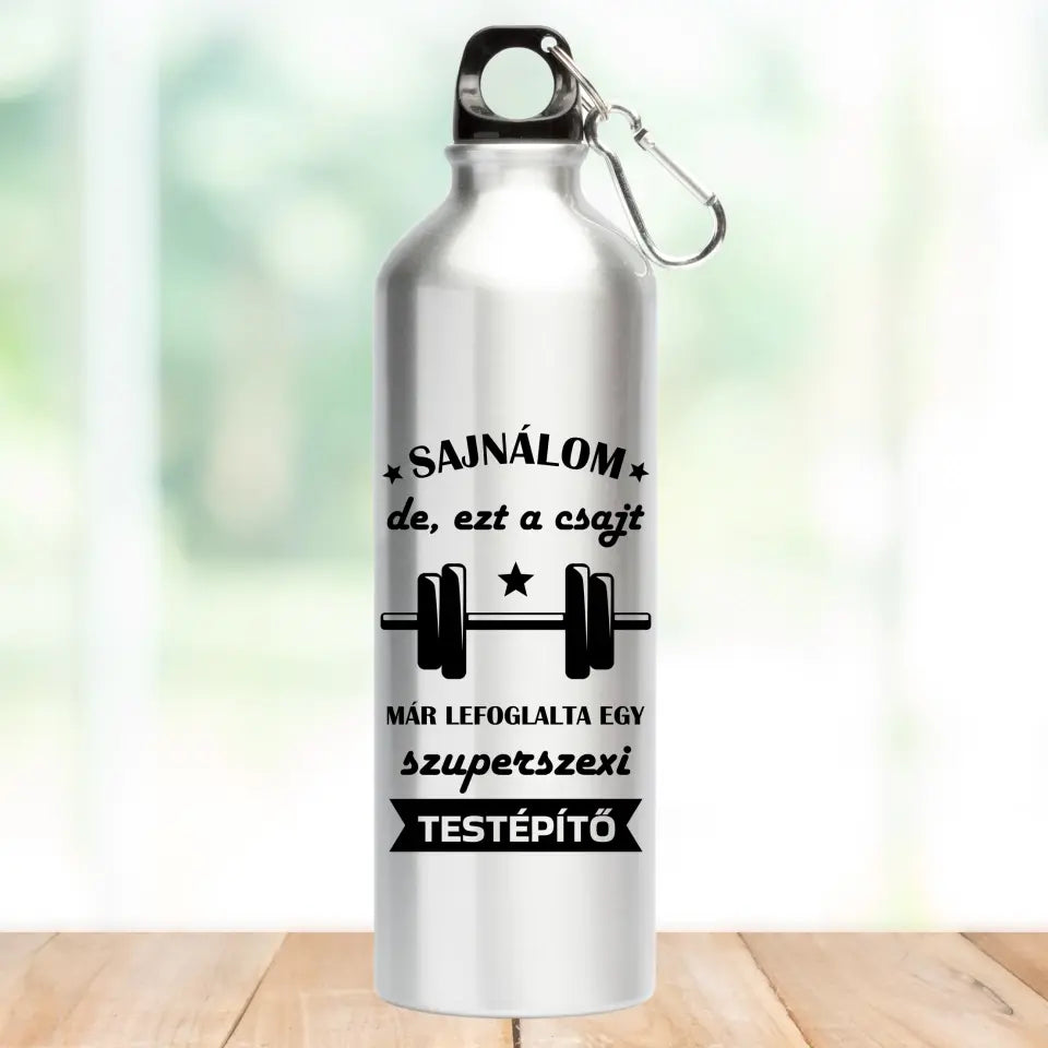 Menő, alumínium kulacs sportoló nőknek. Karabinerrel ellátva. A kulacson egy edző súly látható, ,, Sajnálom de ezt a csajt már lefoglalta egy testépítő,, feliratokkal ellátva. Vidd magaddal az edzőterembe.
