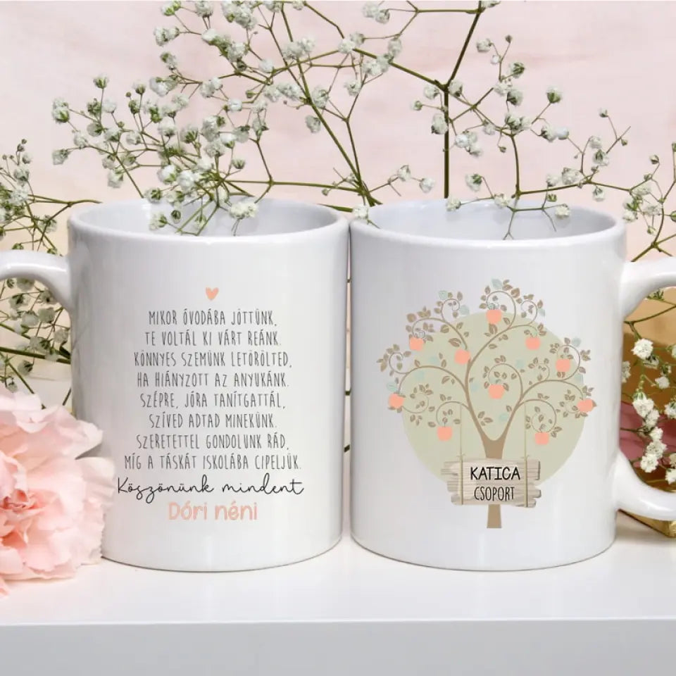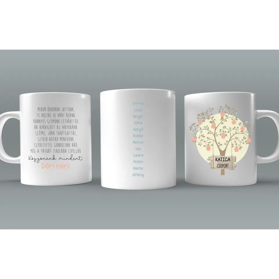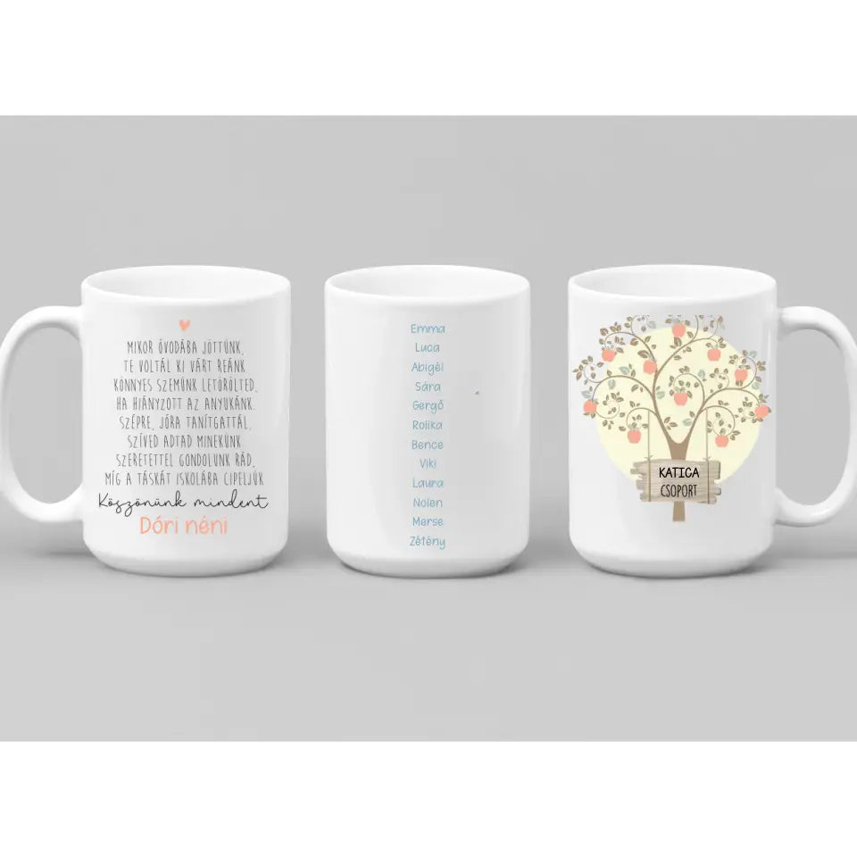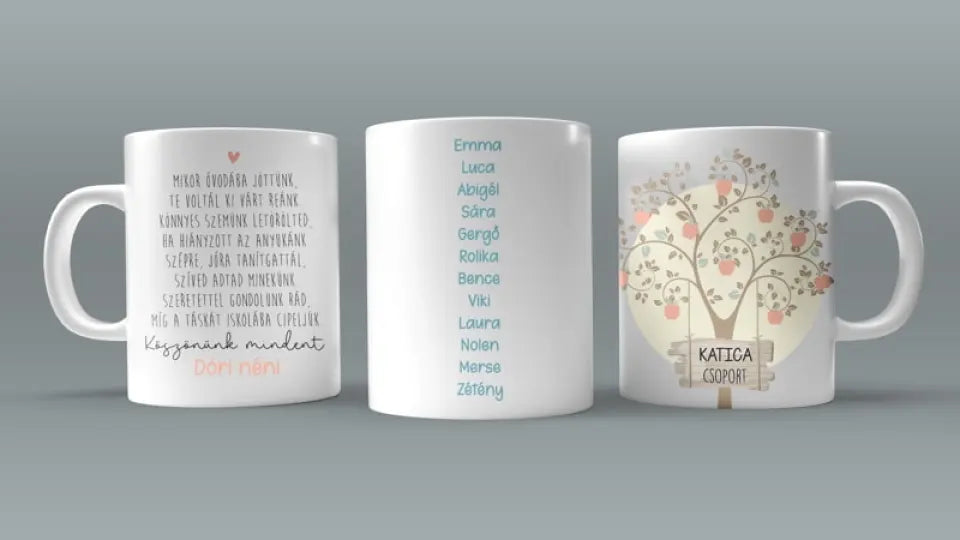 A kerámia bögre 2 oldalas, a palástját lásd a termékfotóknál. Az egyik oldalon egy almafa díszeleg, az aljában az általad megadott csoport név fog szerepelni. A bögre közepén az ovis csoport gyermekeinek keresztneve szerepel, a bögre túloldalán, pedig egy szívet melengető búcsúzó szöveg olvasható, illetve az aljába az óvónéni neve kerül.