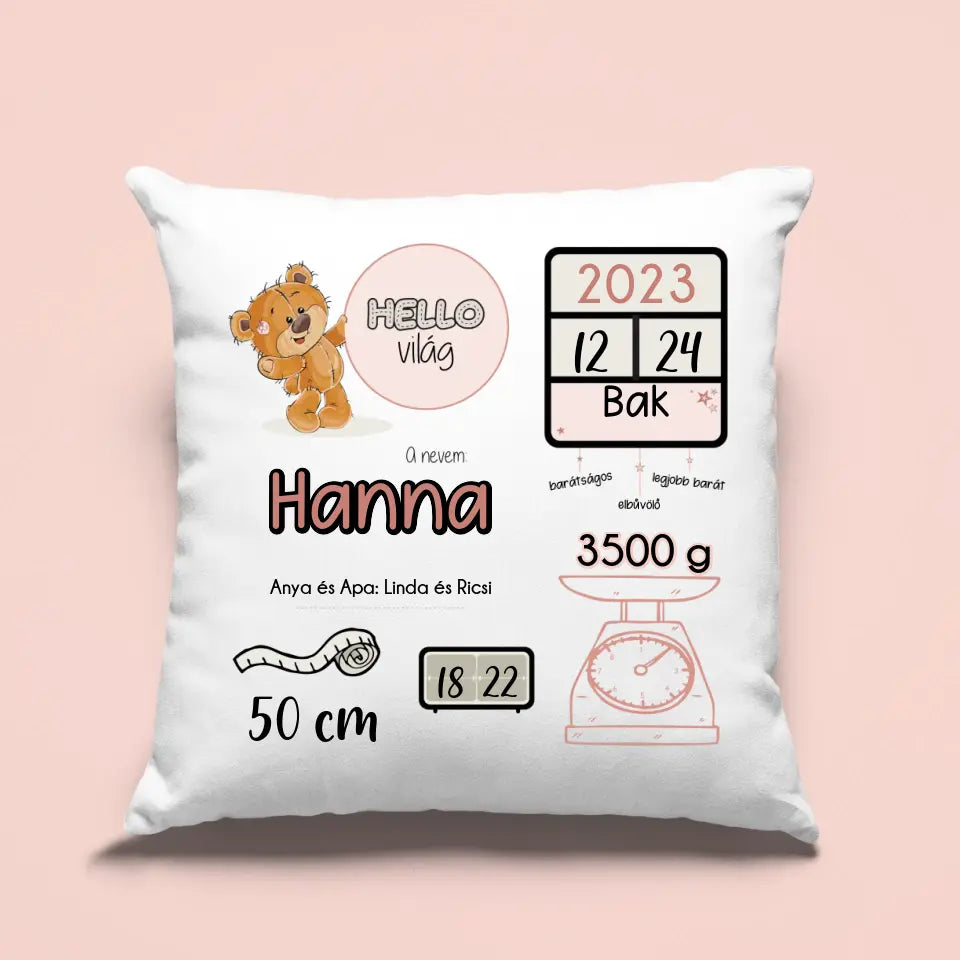 A baba emlékőrző egyedi párna a Te kisbabád születésének emlékét őrzi. A létező legtündéribb párna, ami magán viseli a baba születési adatait és a bájos kis nevét. Ezen felül egy cuki macikával és babás hangulatú grafikai elemekkel tesszük még kedvesebbé. Cuki ajándék édesanyák, keresztanyák, vagy nagymamák számára.