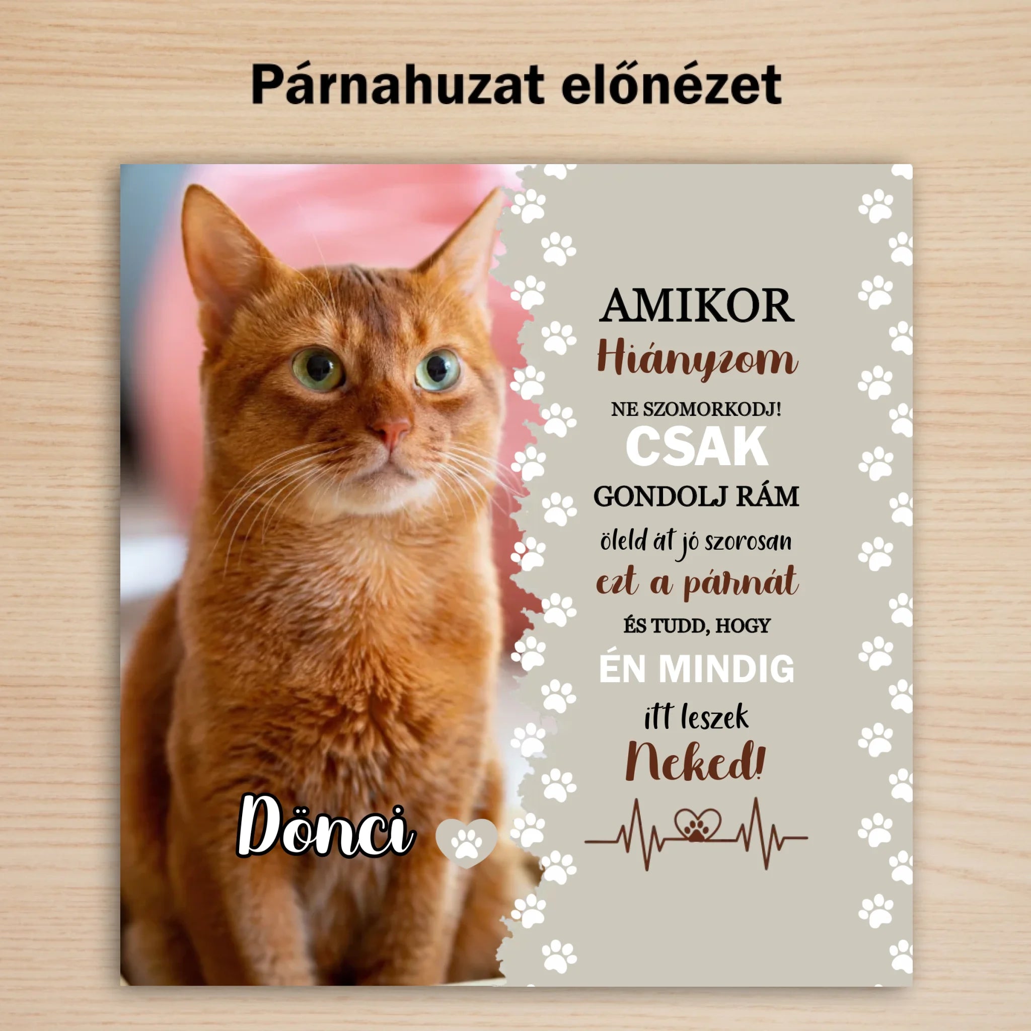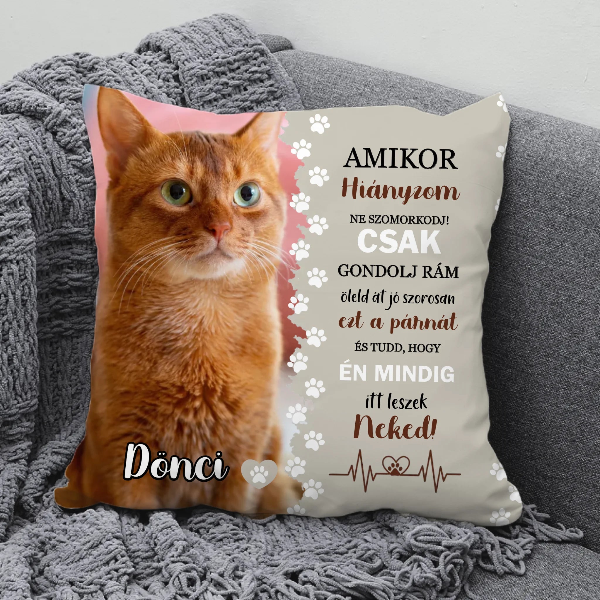 Személyre szabható párna, amire az általad megadott kép kerül a cicusról, a kiskedvenc nevét is megadatod. A párnára egy igazán megható idézet kerül: „Amikor hiányzom, ne szomorkodj! Csak gondolj rám, öleld át jó szorosan ezt a párnát és tudd, hogy én mindig itt leszek Neked!”. Ezt az idézetet olvasva biztosan megfog hatódni.