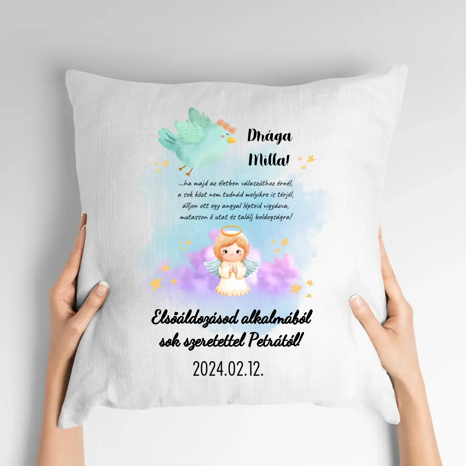 A párnán egy kék színű kismadár és egy aranyos angyalka grafikája látható, kellemes hangulatú, kékes-lilás színű háttérrel. A párnát teljesen személyre tudod szabni, a huzatra az általad megadott nevek, szöveg és dátum kerül. Ezen kívül a párnára a következő szöveg kerül: „… ha majd az életben válaszúthoz érnél, a sok közt nem tudnád melyikre is térjél, álljon ott egy angyal lépteid vigyázva, mutasson ő utat és találj boldogságra!”. Az ajándékozott sok-sok év után is, ha elolvassa ezt az idézetet, biztosan megfog hatódni és eszébe jutnak majd a szép emlékek.