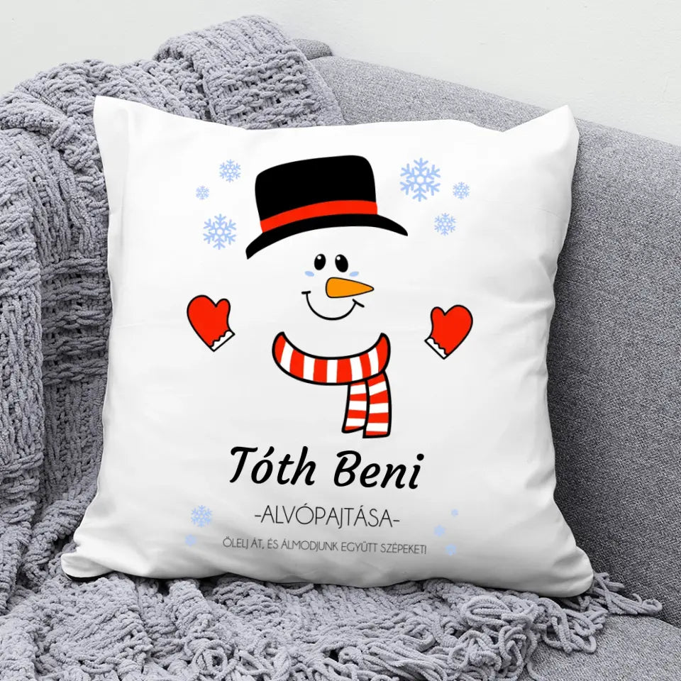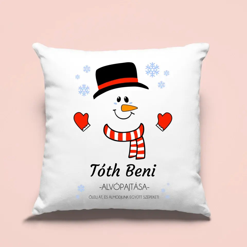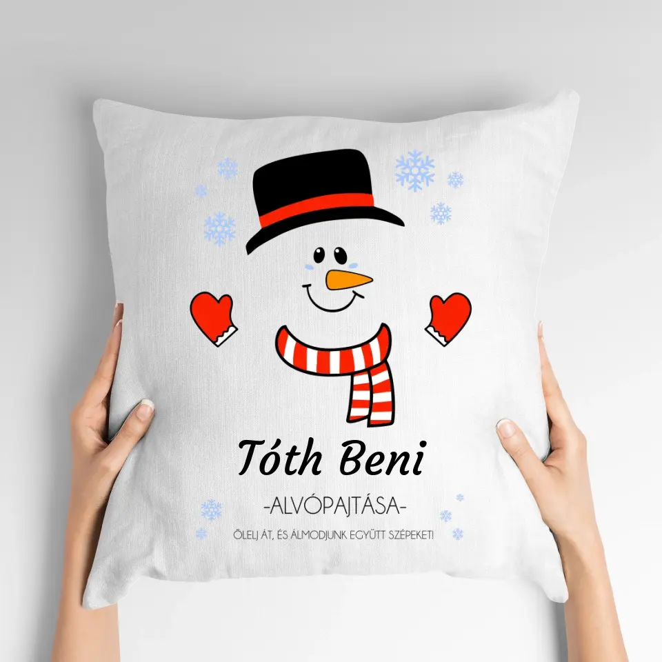 Fehér színű, saját névvel ellátott, hóemberes karácsonyi ölelős párna. Különleges és egyedi karácsonyi ajándék ötlet a gyermekednek. Egy kis baráttal könnyebb lehet az elalvás.