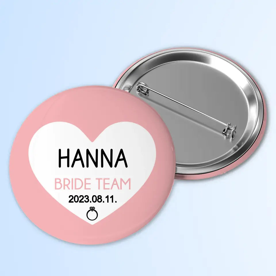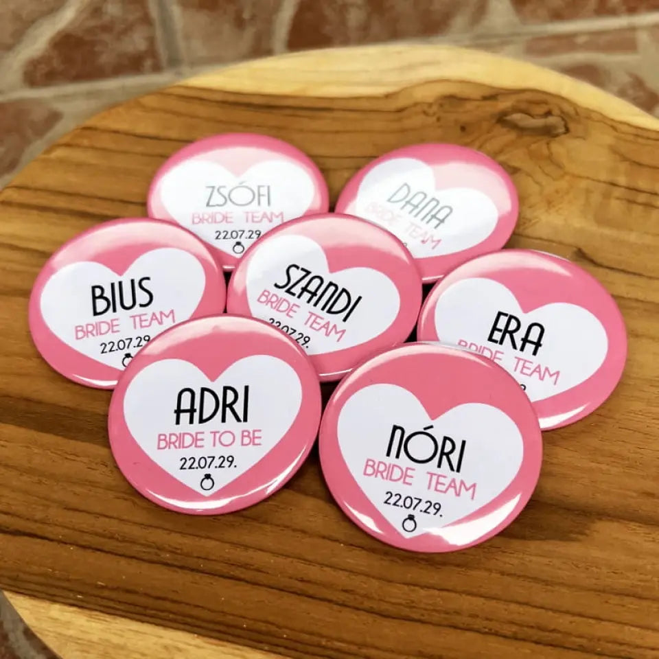 A lánybúcsúra készült kitűző mérete 43 mm átmérőjű és fém anyagú. Egyszerűen felhelyezhető pólóra, táskára, vagy szalagra. Mutatós és emlékezetes kiegészítője lehet a bulinak. Add meg rá a menyasszony nevét, a lánybúcsú dátumát és a többi tag keresztnevét. Ha szeretnél egyéb feliratot a kitűzőre, mint például "Bride team", "Girl squad", vagy "Bride to be", akkor ezt is írd oda a névhez.