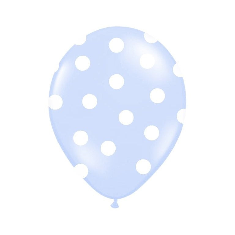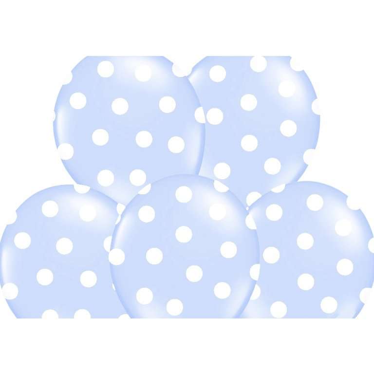Fehér pontokkal printelt világoskék pöttyös lufi. Bármilyen ünnepségre vagy partyra alkalmasak. Héliummal és levegővel is felfújhatóak.