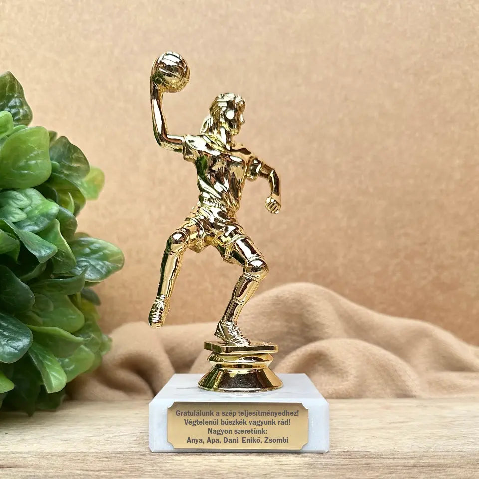 Ha van a családodban egy olyan lány, aki imád kézilabdázni, és éppen számára kutatsz ajándékok után, akkor nem kell tovább keresgélned. Ugyanis ez a személyre szabható kézilabdázóknak készült ajándék szobor tökéletes választás lehet számára. A márványtalpazaton egy aranyszínű kézilabdázó nő szobra helyezkedik el, aki épp arra készül, hogy eldobja a labdát. Mi leginkább kézilabdázó hölgyeknek javasoljuk a szobrot, de nyugodtan ajándékozhatod férfiaknak is. Bármilyen alkalomra tökéletes ajándék lehet, legyen az születésnap, névnap vagy karácsony, de még egy verseny díja is lehet ez a szuper szobor.