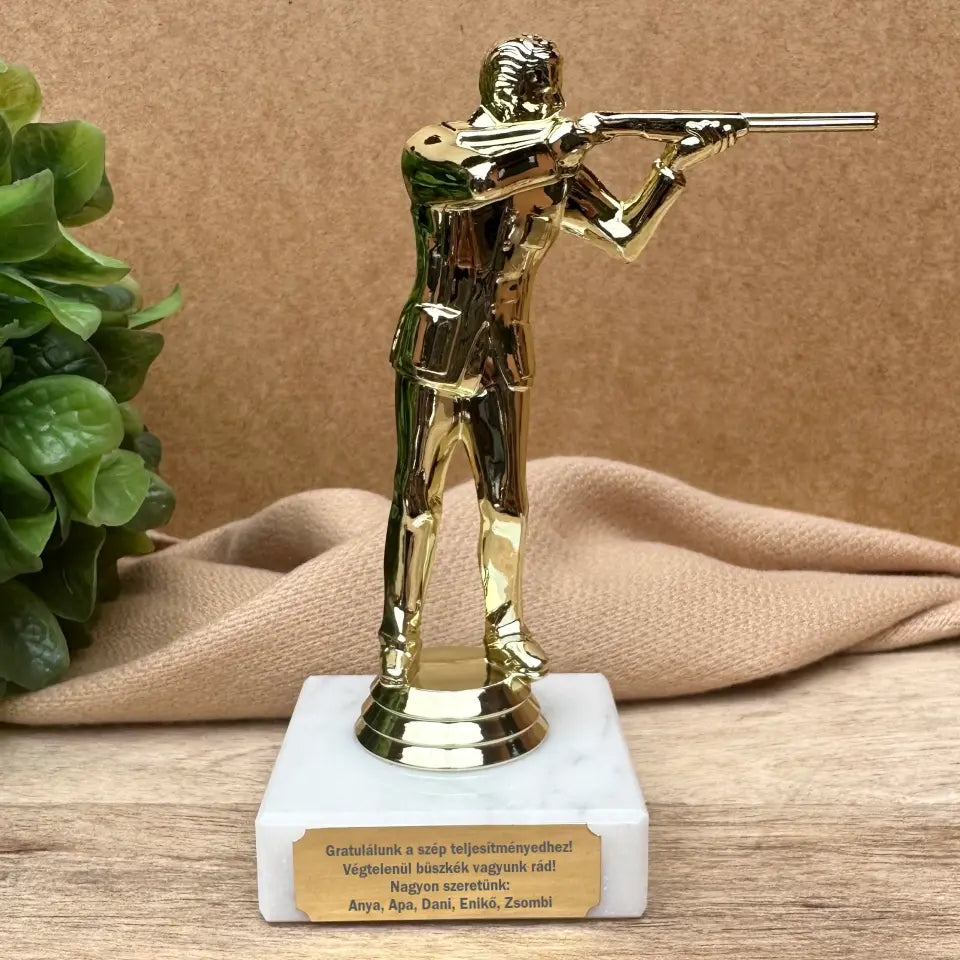 Arany színű, márványtalapzatú vadász ajándék szobor. Különleges és egyedi ajándék vadász férfiaknak. Lepd meg vele a nagypapát és apát.