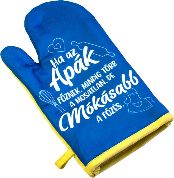Az apák csodálatos emberek, akik ha a konyha közelébe kerülnek, isteni ételeket képesek varázsolni a szeretteiknek, és hát melyik apa ne szeretne főzni. Minden főzés alap kelléke egy edényfogó kesztyű így biztosan hasznos ajándék lesz az apukádnak. Aranyos felirat és minta díszíti a kesztyűt így a mosoly és az ölelés garantált lesz az átadásnál.