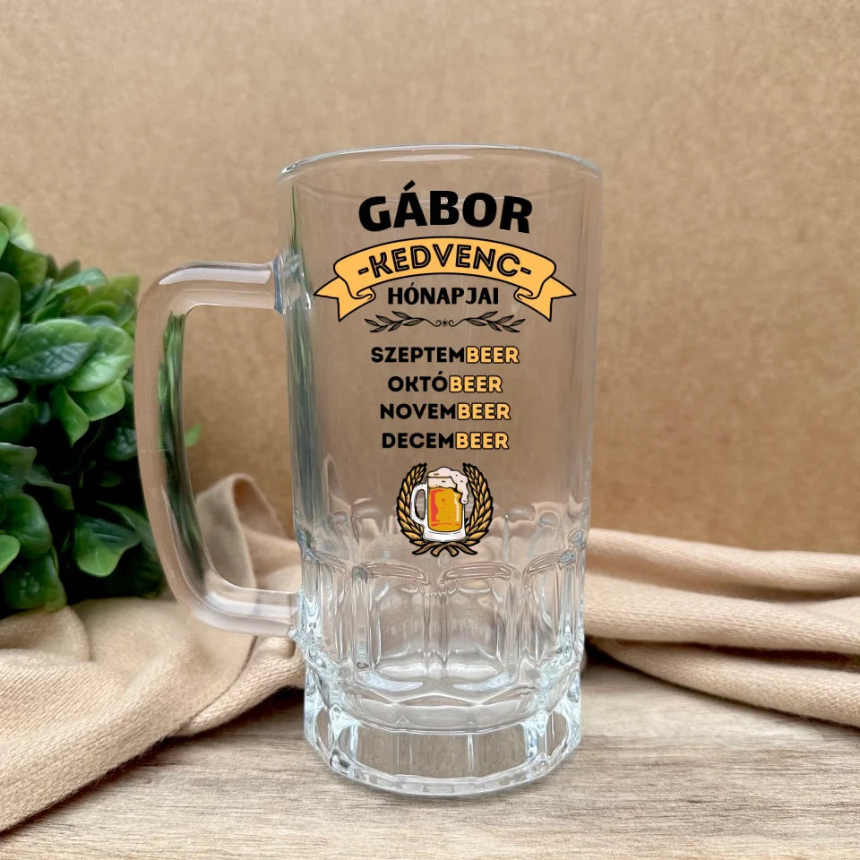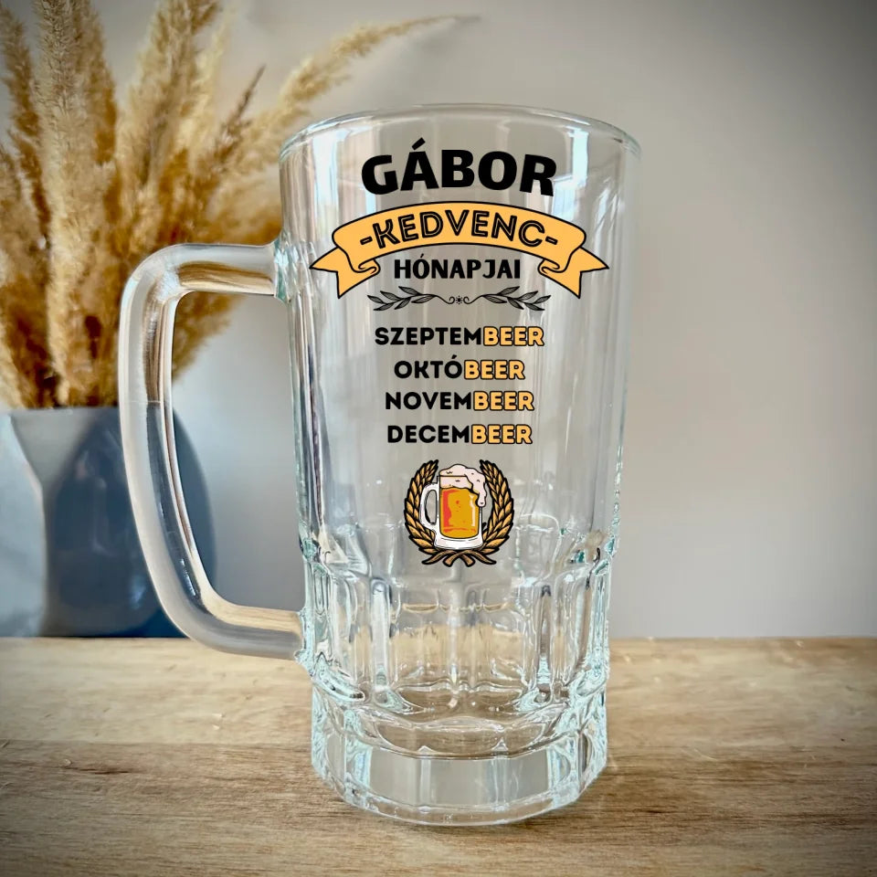 Vicces és egyben vagány söröskorsó, egyedi kivitelben olyan férfiaknak, akik egyszerűen imádnak sörözni. A korsóra az alábbi felirat kerül: "XY" kedvenc hónapjai, szeptembeer, októbeer, novembeer, decembeer. Hát nem jópofa? :-D