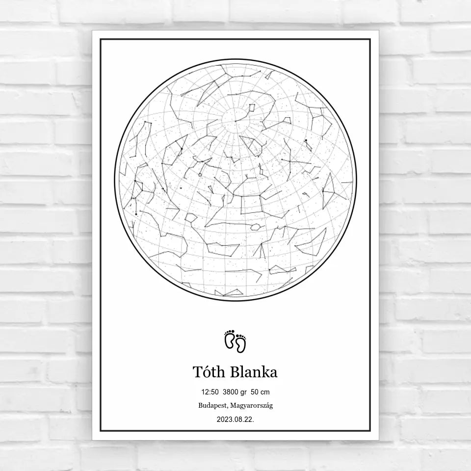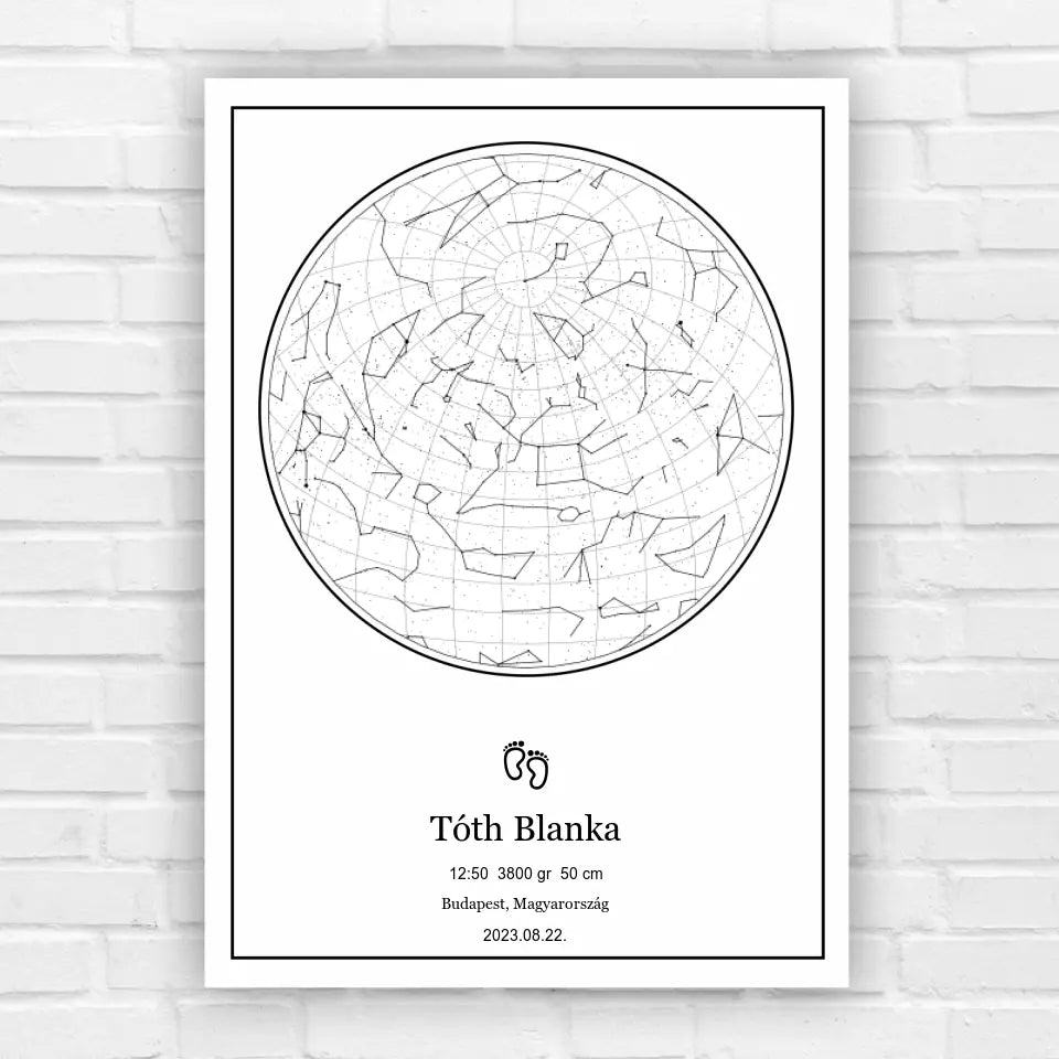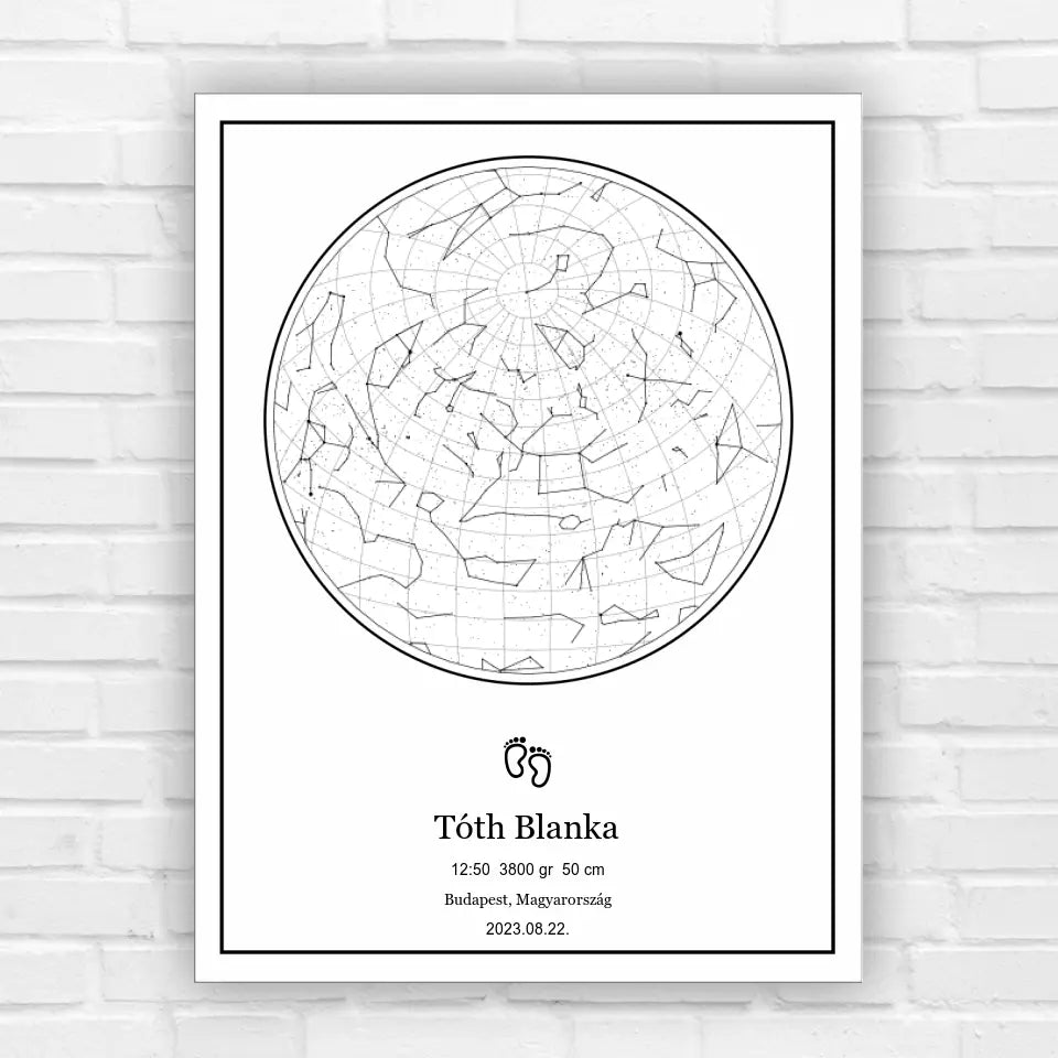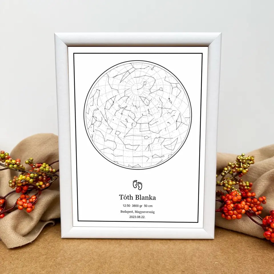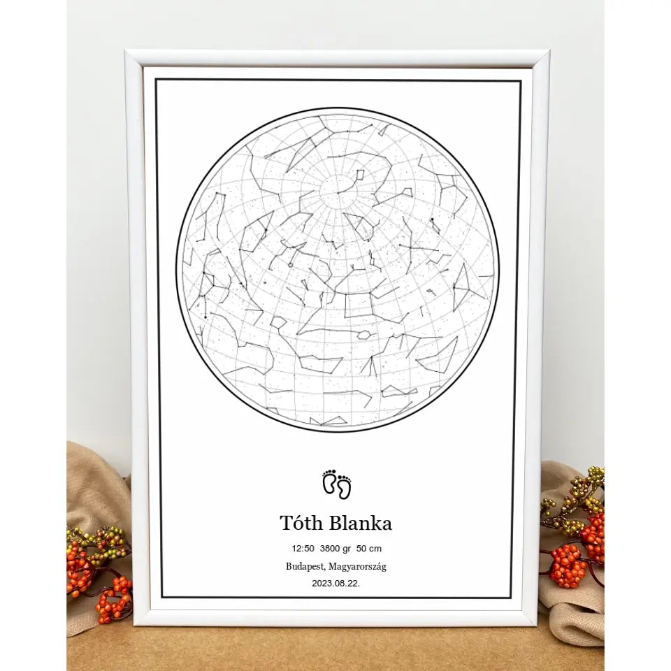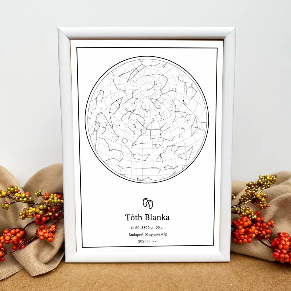 Varázslatos babaköszöntő ajándék szülőknek. Tökéletes meglepetés baba érkezésekor, vagy keresztelőre. A csillagtérkép a kisbabád születéséről mesél. Cuki, baba emlékőrző kép.